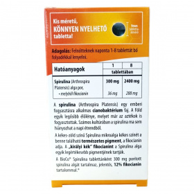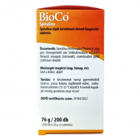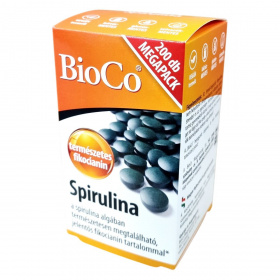 A spirulina (Arthrospira Platensis) egy emberi fogyasztásra alkalmas cianobaktérium faj, mely a Föld egyik legősibb élőlénye, és történelmi idők óta ismert, például az aztékok is fogyasztották. A kékes-zöld mikroalga jellegzetes színét a benne található természetes pigment, a fikocianin adja, melyet a „királyi kék” fikocianinnak is neveznek, és a spirulina algában egyik legértékesebb pigmentként tartanak számon. A BioCo® Spirulina tabletta jelentős, 12%-os fikocianin tartalommal készült, mely tablettánként 300 mg porított spirulina algát tartalmaz. A termék fejlesztése és gyártása Magyarországon történik, bár a hatóanyagok nem származnak Magyarországról. Kisméretű, könnyen lenyelhető, 9 mm átmérőjű tabletta formában érhető el, és figyelembe veszi a modern étrendi irányzatok igényeit, így vegán, valamint mentes a laktóztól, gluténtől és színezékektől. A termék gyártója a BioCo Magyarország Kft., mely ISO 22000 szabványnak és a Jó Gyártási Gyakorlatnak (GMP) megfelelő élelmiszerbiztonsági rendszert üzemeltet.