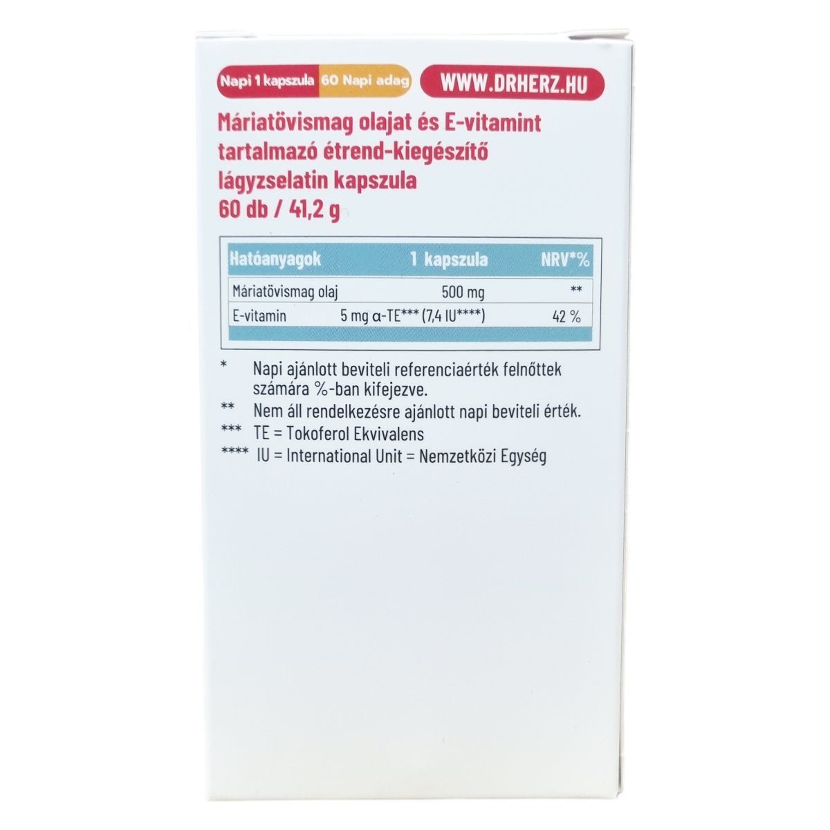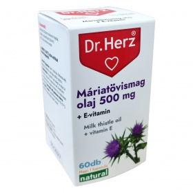 A Dr.Herz® Máriatövismag olaj 500 mg + E-vitamin kapszula egy olyan természetes alapanyagokból készült étrend-kiegészítő, amely könnyen adagolható lágyzselatin kapszulák formájában elérhető kiszerelésben. A terméket a gyógyszertárakban és gyógynövényboltokban is megtalálhatja, ahol a márka termékpalettáján vitaminok, étrend-kiegészítők, belsőleges oldatos cseppek, hidegen sajtolt olajok, 100% természetes illóolajok és gyógynövényes krémek is megtalálhatók. A termék fogyasztásával a felhasználók támogathatják az immunerősítést, az anyagcsere folyamatokat, valamint hozzájárulhatnak a szív- és érrendszer, a csontok, porcok, ízületek egészségéhez. A kapszula használata egyszerű, napi egy adagolás elegendő, amelyet főétkezés előtt ajánlott bevenni. Fontos, hogy az ajánlott adagot ne lépje túl, és a kiegészítő nem helyettesíti a kiegyensúlyozott étrendet és az egészséges életmódot.