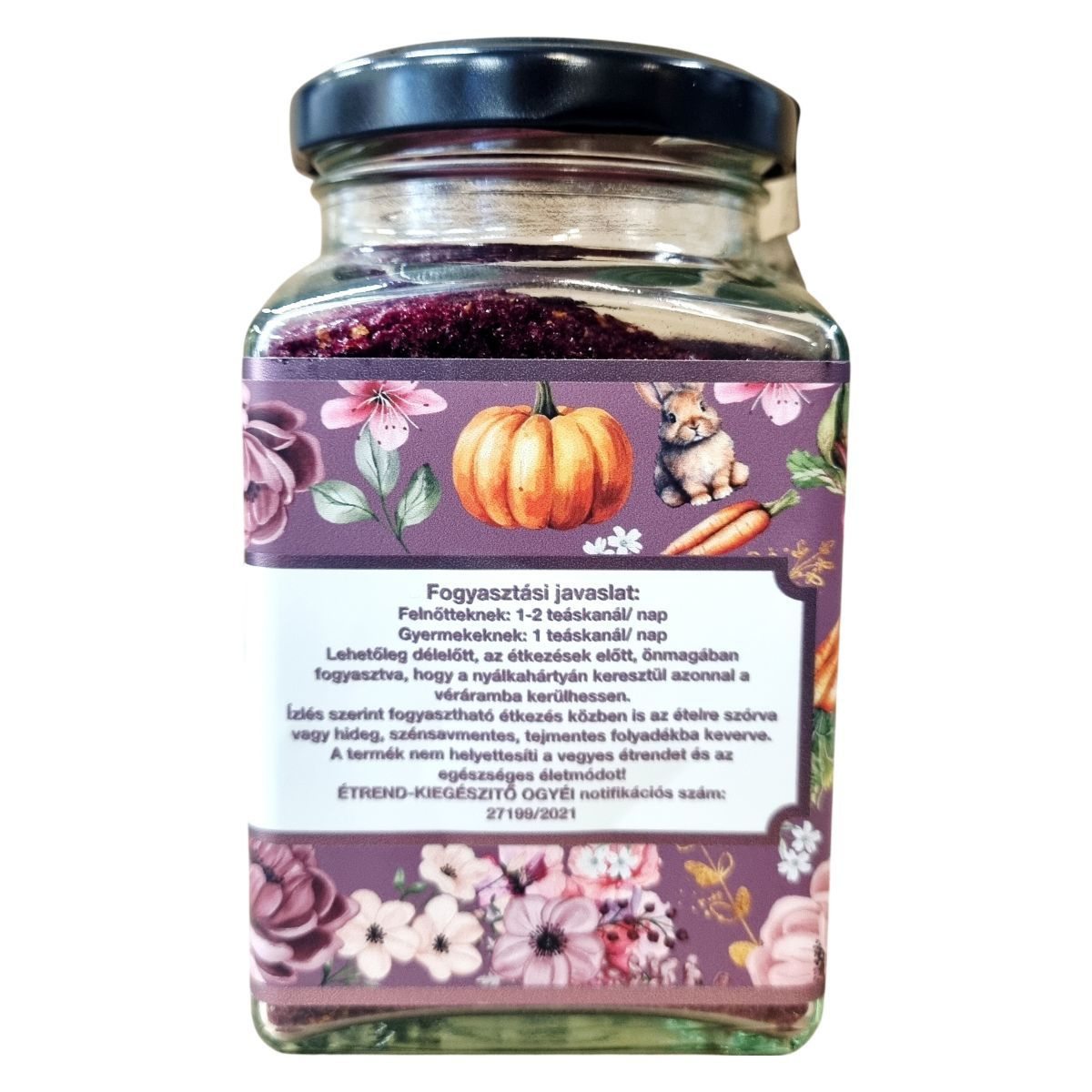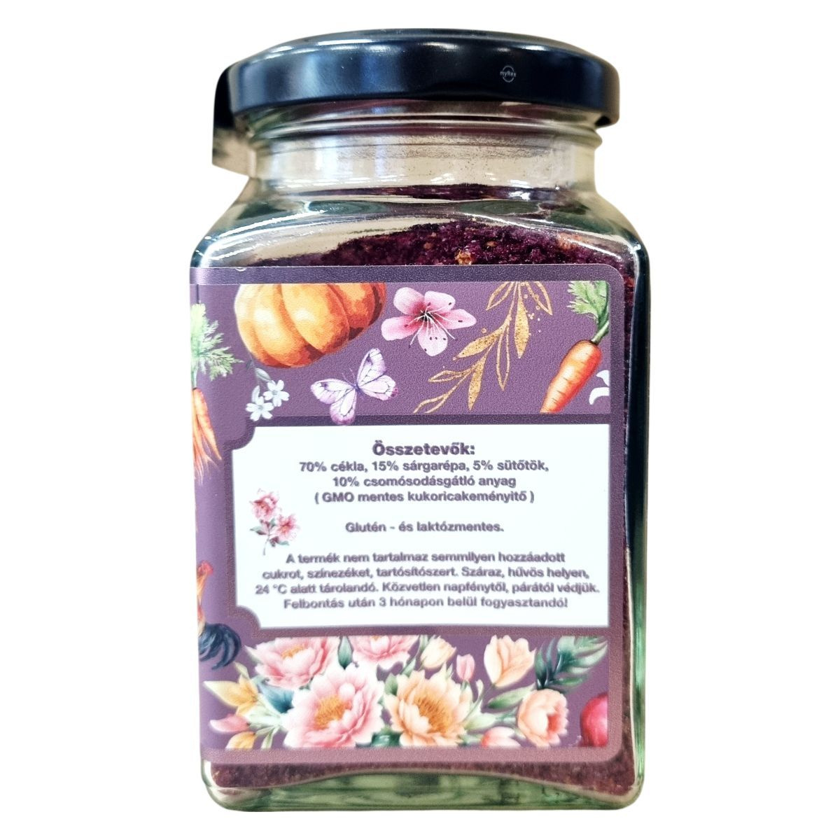70% cékla, 15% sárgarépa, 5% sütőtök, 10% csomósodásgátló anyag (GMO mentes kukoricakeményítő)