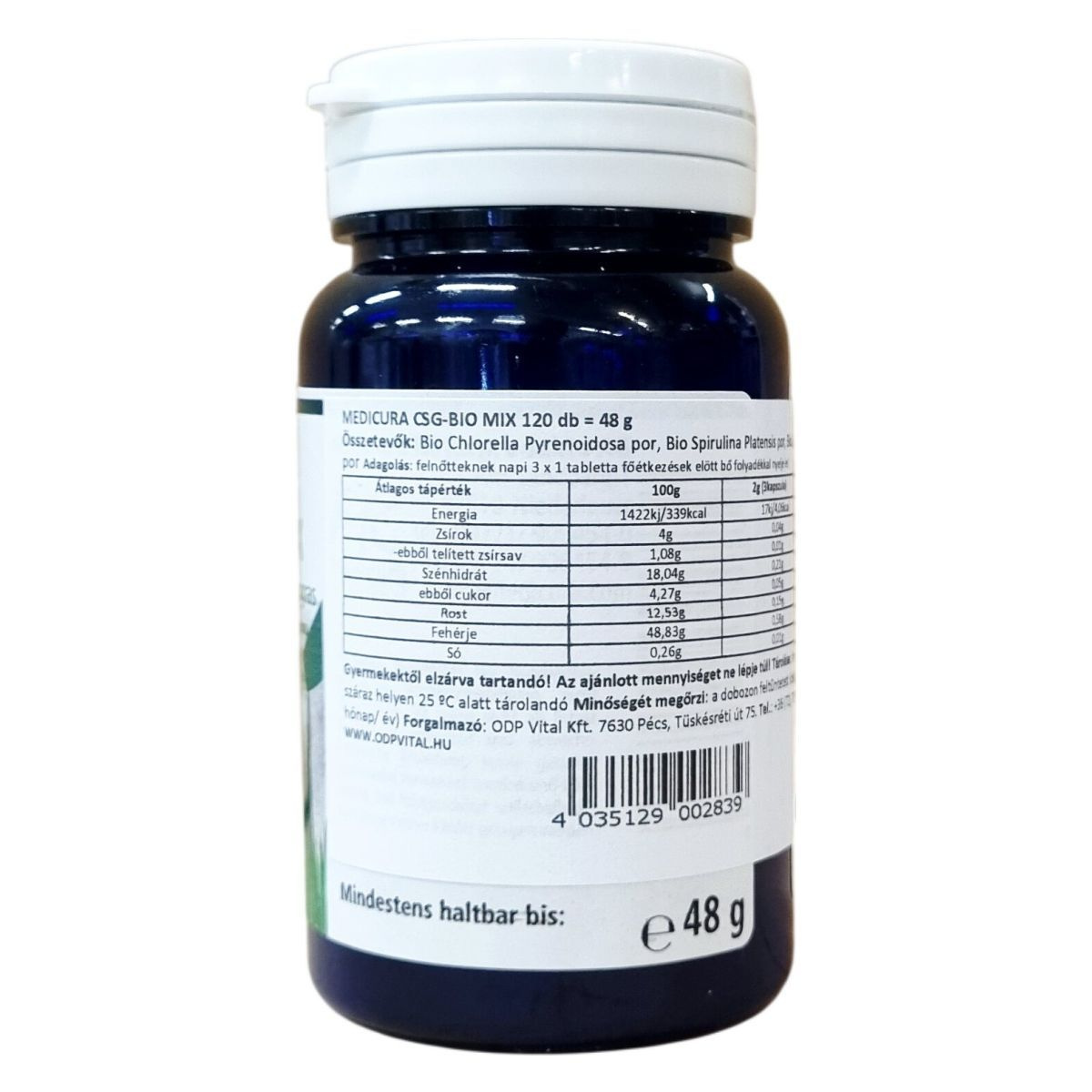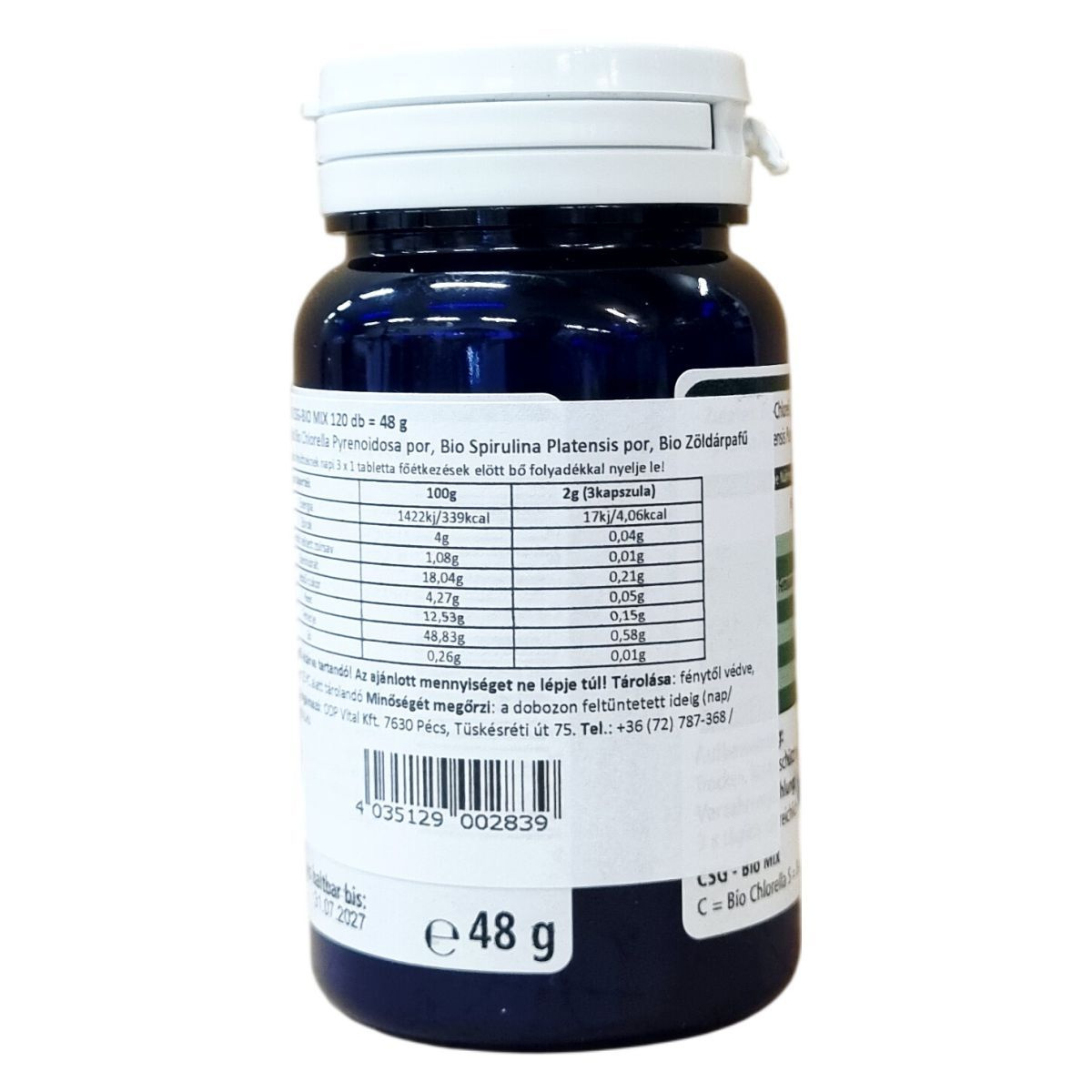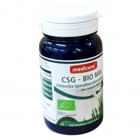 CSG - BIO MIX. Bio chlorella, bio spirulina és bio zöldárpafű keveréke. 120 préselt tabletta, nettó tömeg: ℮ 48 g. Nem EU mezőgazdaság. C = Bio Chlorella, S = Bio Spirulina, G = Bio Zöldárpafű. Minőségét megőrzi: a dobozon feltüntetett ideig (nap/hónap/év).