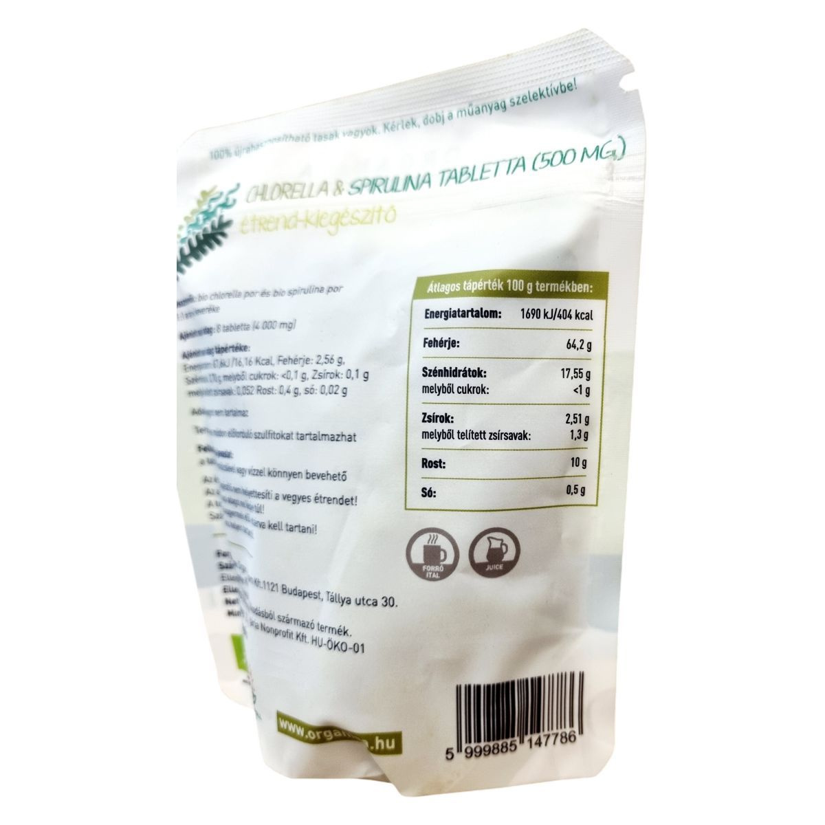 A Chlorella & Spirulina tabletta 100% bio összetevőkből készül, ellenőrzött ökológiai gazdálkodásból származik, és a Biokontroll Hungária Nonprofit Kft. által ellenőrzött. A termék 100% újrahasznosítható tasakban érkezik, amelyet a műanyag szelektív hulladékgyűjtőbe lehet dobni. A tabletták természetes módon előforduló szulfitokat tartalmazhatnak, és adalékanyagot nem tartalmaznak. A termék származási helye Kína, és a forgalmazó a budapesti székhelyű Organiga Team Kft.