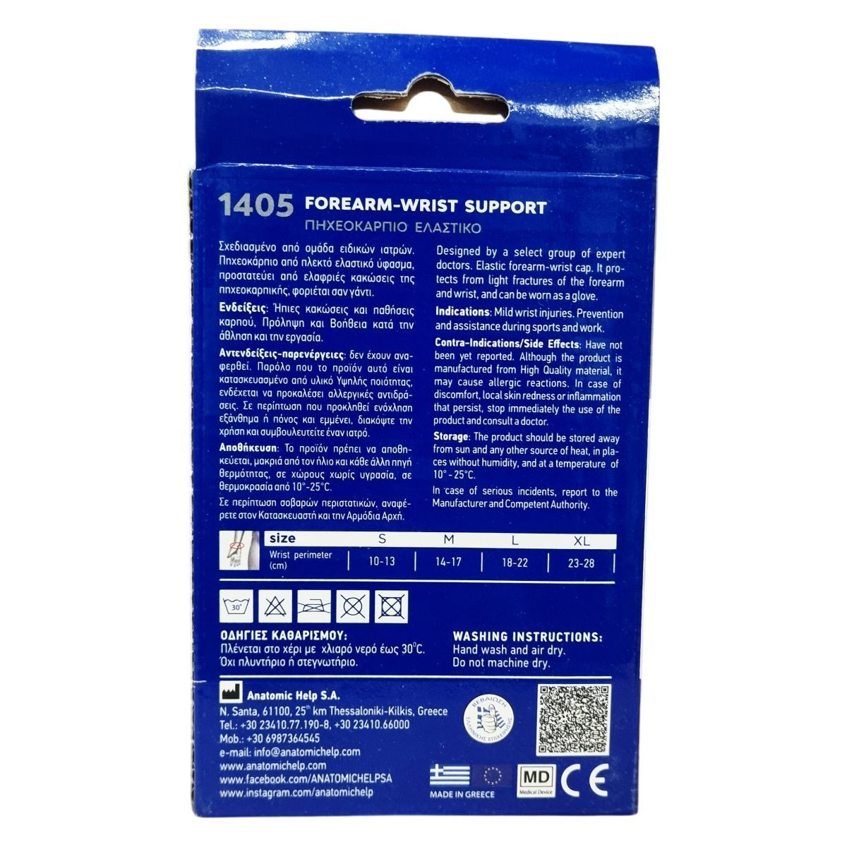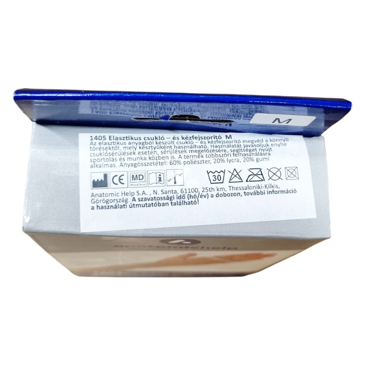 Az Anatomic Help 1405 típusú elasztikus csukló- és kézfejszorító egy szakértő orvoscsapat által tervezett termék, amely világos sérülések és panaszok kezelésére alkalmas. Rugalmas, kötött anyagból készül, és kesztyűként viselhető, így védelmet nyújt a csukló könnyebb sérüléseivel szemben. Különféle méretben érhető el, a csukló kerülete szerint S-től XL-ig: 10-13 cm, 14-17 cm, 18-22 cm, illetve 23-28 cm. A termék kézi mosással tisztítható 30°C-ig, mosógép és szárítógép használata nem ajánlott. Használaton kívül a terméket úgy kell tárolni, hogy elkerüljük a közvetlen napfényt és a hőt, továbbá védjük a nedvességtől. Bár eddig nem jelentettek mellékhatásokat, allergiás reakciók előfordulhatnak, ezért a használat során bármilyen kellemetlenség esetén szakemberhez kell fordulni. Ha súlyosabb problémák adódnak, a gyártó és az illetékes hatóság értesítése szükséges.