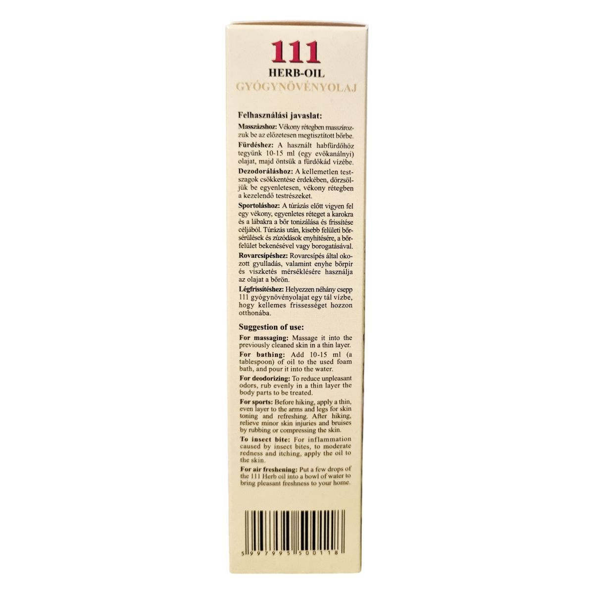 A 111 féle gyógynövényt és illóolajat tartalmazó keverék bőrápoló, antiszeptikus, bőrkondicionáló, gyulladást és irritációt csökkentő, dezodoráló, tonizáló és frissítő hatású. A termék hűsítő mentolt és bőrápoló E-vitamint is tartalmaz, melyek fokozzák a masszázsterápia jótékony hatásait. Használatával frissességet és kellemes érzést biztosít a bőr számára, valamint enyhíti a rovarcsípések és kisebb bőrsérülések okozta kellemetlenségeket. A termék többféle felhasználási módot kínál, mint például fürdőhöz adva, masszázshoz, dezodoráláshoz, sportoláshoz, rovarcsípés kezelésére, valamint légfrissítésre otthon.
