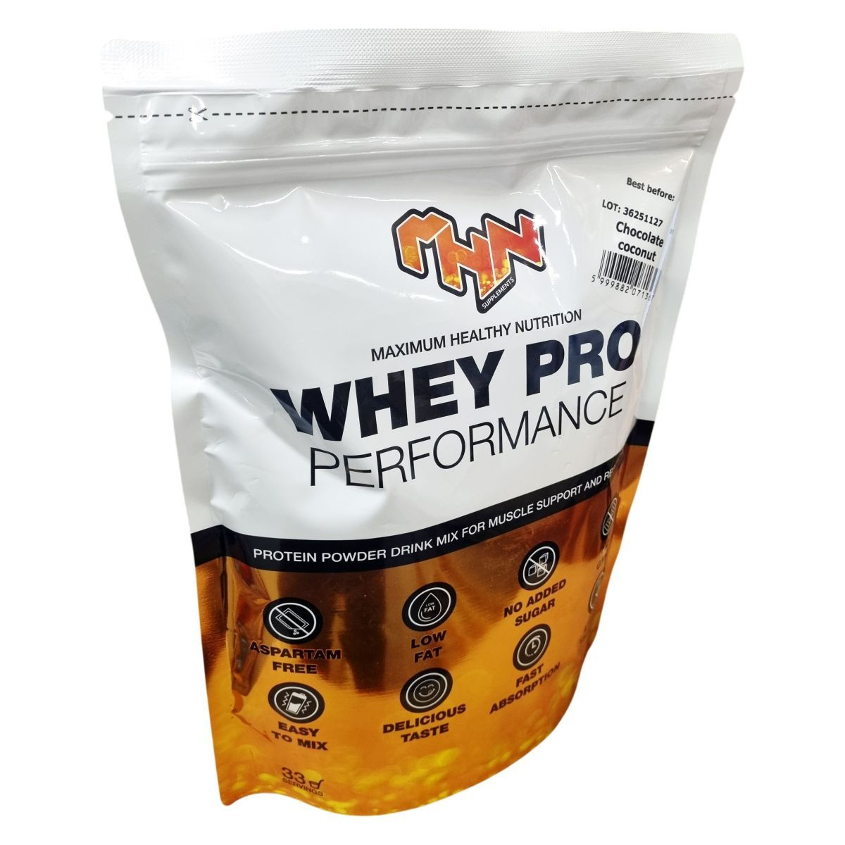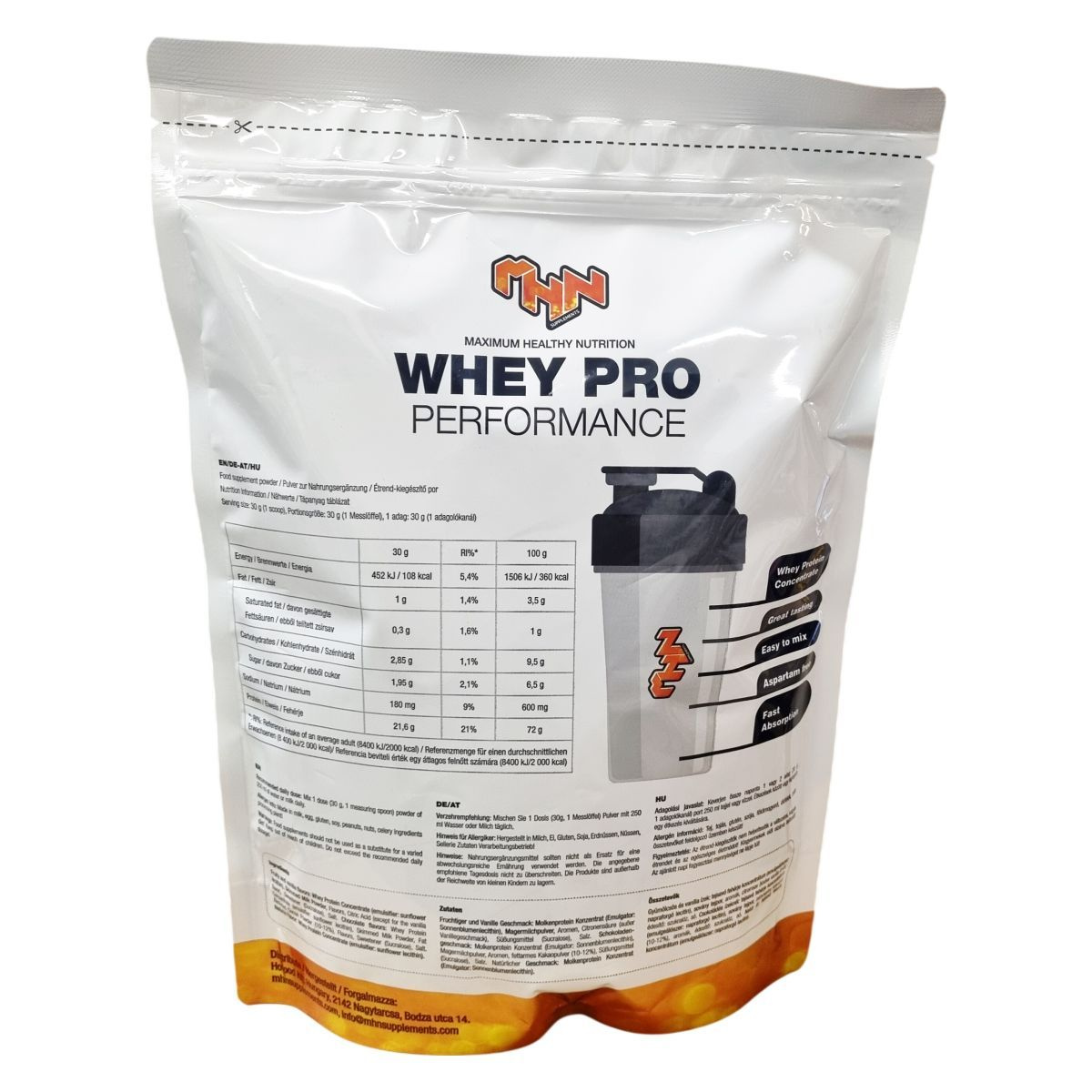A MHN Whey Pro Performance egy tejsavófehérje alapú étrend-kiegészítő por, amely alacsony zsírtartalommal és hozzáadott cukor nélkül készül. Terméke aszpartámmentes, nem tartalmaz GMO-összetevőket, és könnyen oldódik, így gyors felszívódást biztosíthat. A por ízvilága csokoládé-kókusz, a termék rendszeres fogyasztási javaslata napi 1 vagy 2 adag, amely 250 ml víz vagy tej hozzáadásával fogyasztható, különösen étkezések között vagy edzés után ajánlott. Az allergén információk szerint a termék tej, tojás, glutén, szója, földimogyoró és diófélék jelenlétére figyelmeztet, illetve az összetevőket feldolgozó üzem környezete miatt. A termék laboratóriumi teszteken esett át, így minősége kontrollált. Nem helyettesíti a kiegyensúlyozott étrendet, és kisgyermekektől elzárva kell tartani.