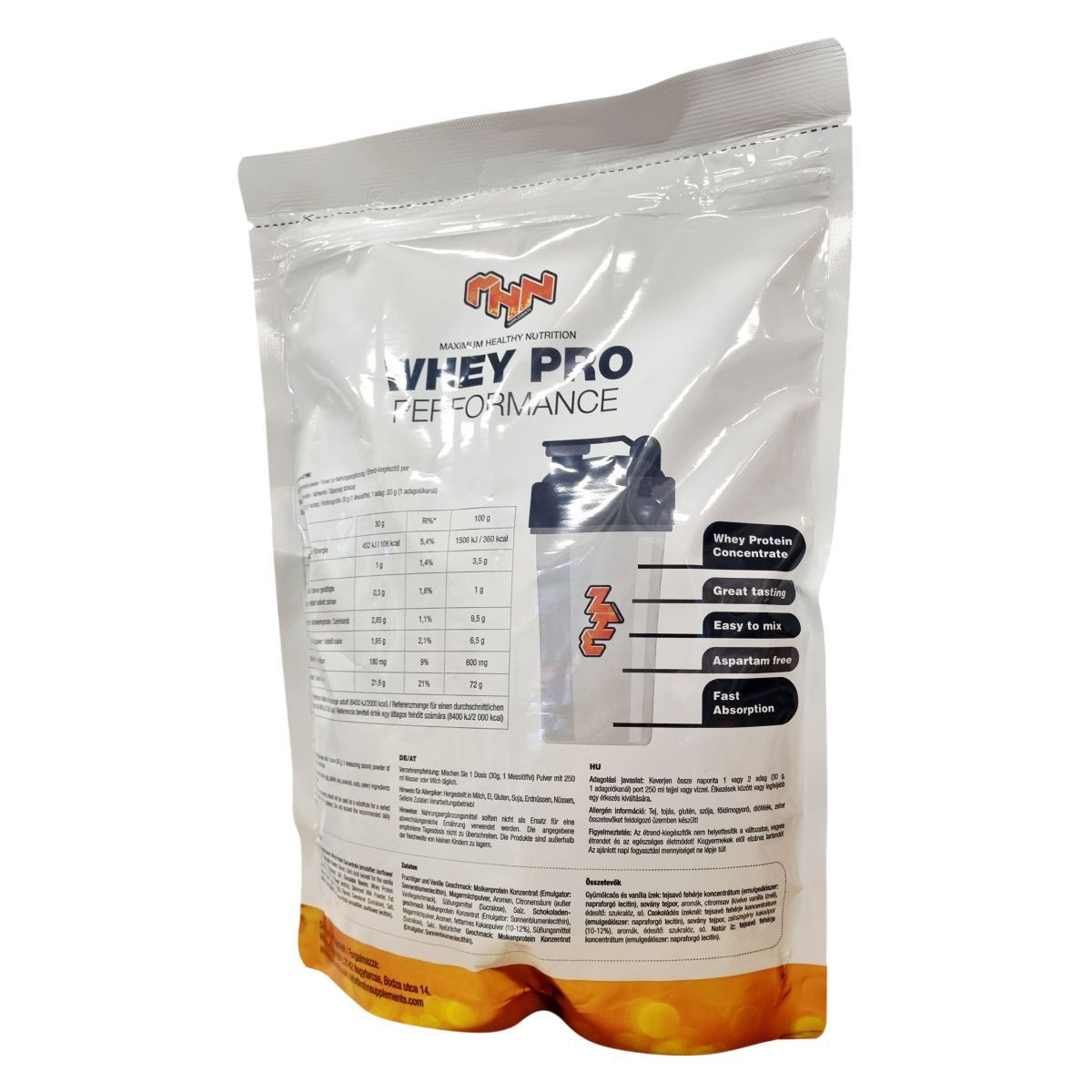 A Maximum Heal Nutrition Whey Pro Performance egy aszpartámmentes, alacsony zsír- és hozzáadott cukrot nem tartalmazó táplálékkiegészítő fehérjepor. Gyors felszívódású, laboratóriumban tesztelt termék, amely 33 adagnyi kínálatban kapható. Elkészítése egyszerű, a port könnyen lehet vízzel vagy tejjel keverni, az adagoláskor 30 grammnyi port javasolt felhasználni. A termék a csokoládé-mogyoró ízével igyekszik finom fogyasztási élményt nyújtani. Az összetevők között tej, tojás, glutén, szója, földimogyoró, diófélék és zeller előfordulása lehetséges, mivel olyan üzemben készült, ahol ezeket is feldolgozzák.