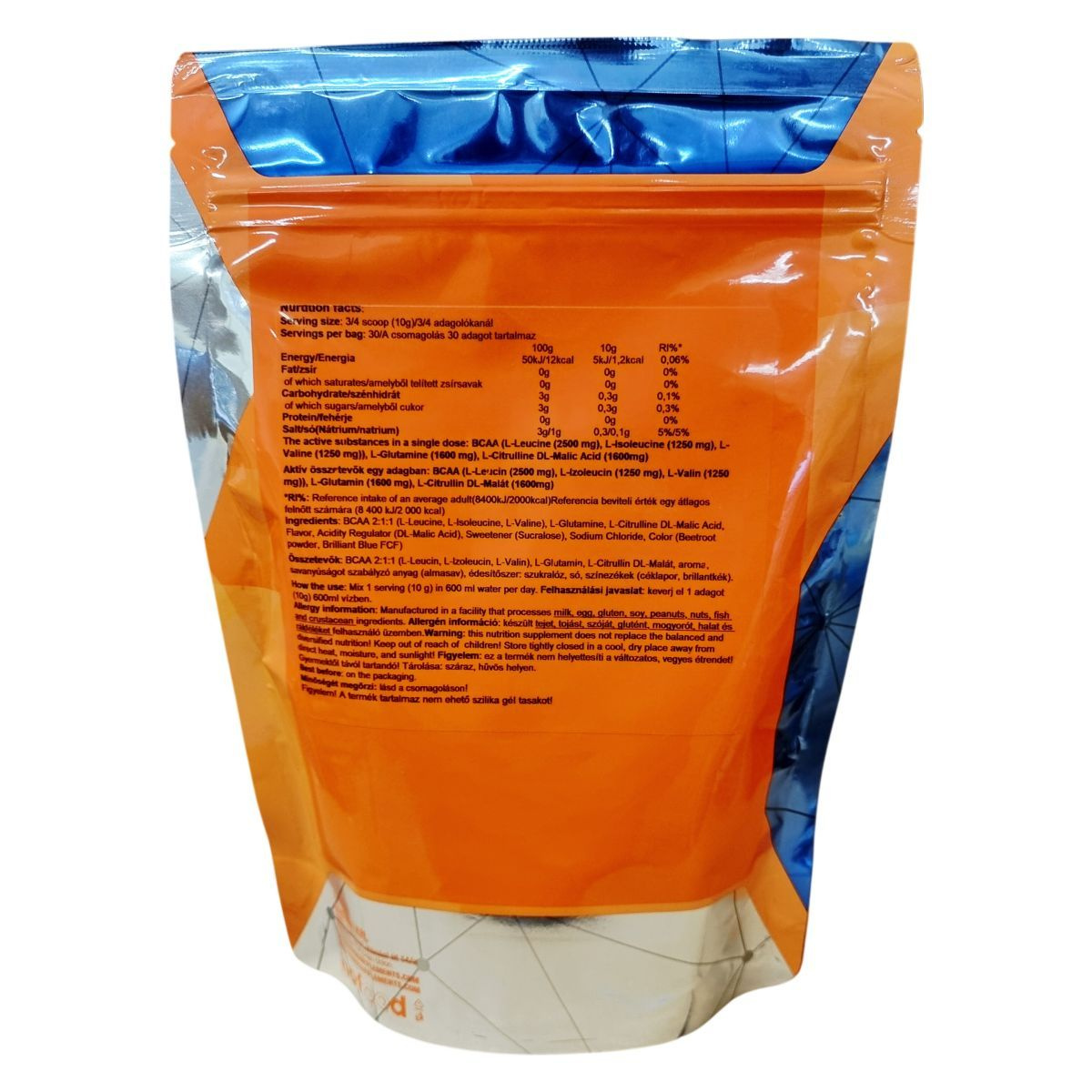 BCAA 2:1:1 (L-Leucin, L-Izoleucin, L-Valin), L-Glutamin, L-Citrullin DL-Malát, aroma, savanyúságot szabályozó anyag (DL-Malát), édesítőszer (szukralóz), só, színezékek (cékla por, briliánszín).