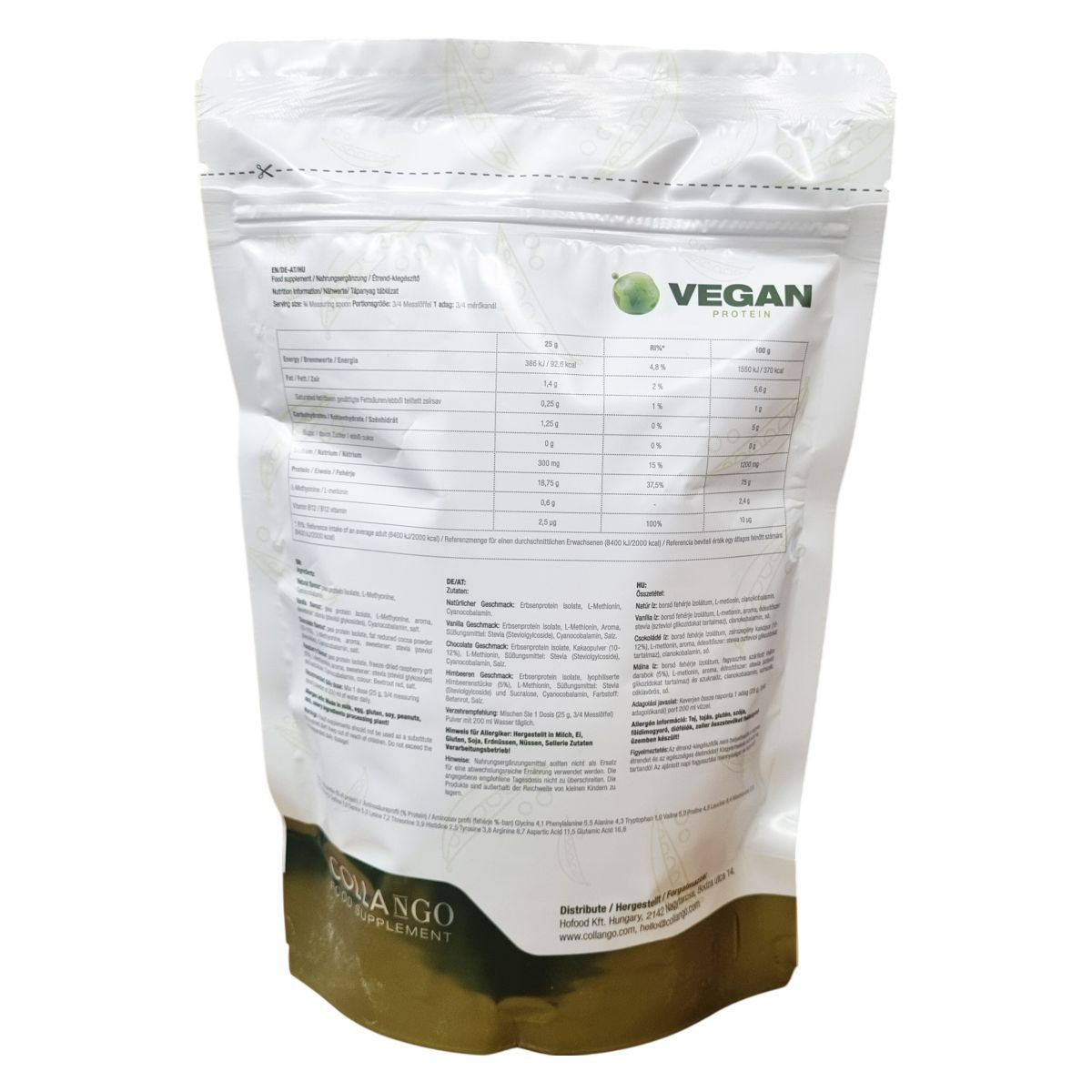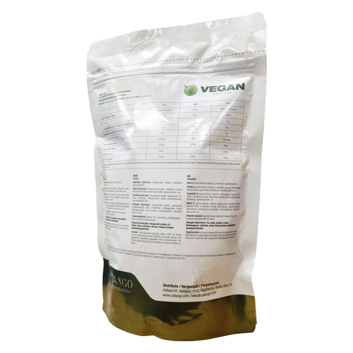 A Vegan Protein egy növényi alapú táplálékkiegészítő, amely elsősorban borsófehérje-izolátumot, L-metionint és B12-vitamint tartalmaz. Többféle ízben elérhető, mint például természetes, vanília, csokoládé és málna, melyek különböző édesítőszereket és egyéb adalékokat is tartalmaznak. Az adalékanyagok között szerepelnek természetes aromák, sztíviasztíviózidok, szukralóz, valamint természetes festékanyagok. A termék magas fehérjetartalma mellett alacsony cukor- és zsírtartalommal rendelkezik. Allergénfeldolgozási információként meg kell említeni, hogy olyan üzemről van szó, amely tej, tojás, glutén, szója, földimogyoró, diófélék és zeller összetevőket is kezel. A termék biztonsági előírásai szerint nem helyettesíti a vegyes étrendet, és az ajánlott napi mennyiséget nem szabad túllépni. A port ajánlott naponta vízzel elkeverve fogyasztani, így használata egyszerű és praktikus.