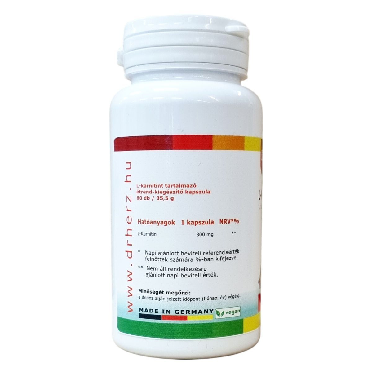 A Dr.Herz L-karnitin kapszula magas tisztaságú Carnipure L-karnitint tartalmaz, amely egy 60 darabos csomagolásban érhető el. A kapszula vegán anyagokból készül, és egy könnyen lenyelhető formában szolgál a napi karnitin bevitelhez. A termék készítése Németországban zajlik. A csomag legalább 60 napi adag L-karnitint biztosít, melyet ajánlott napi egy kapszula formájában, étkezés előtt fogyasztani. A kapszula összetevői között megtalálhatóak a természetes eredetű töltő- és csomósodás-gátló anyagok is. A termék használata mellett javasolt a kiegyensúlyozott étrend és egészséges életmód fenntartása.