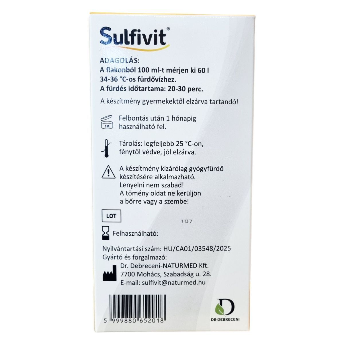A Sulfivit® készítmény a harkányi termálvíz jellegű fürdők elkészítéséhez készült koncentrátum, amely hatóanyagai révén mozgásszervi és bőrgyógyászati betegségek esetén fejti ki hatását. Összetevőinek jótékony hatását szakirodalmi adatok és évszázados tapasztalatok igazolják. Az alkalmazás részletes tájékoztatója a dobozban található. A termék kizárólag gyógyfürdő készítésére használható, tömény formában sem a bőrre, sem a szembe nem kerülhet.