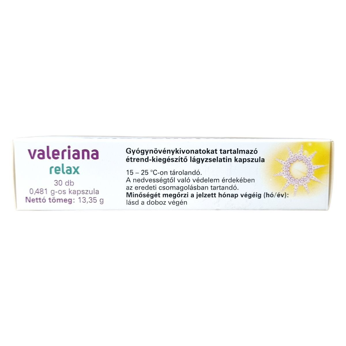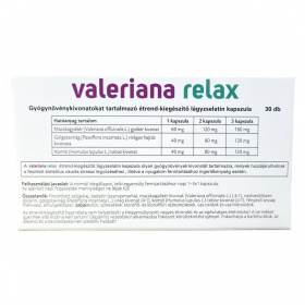 A valeriana relax lágyzselatin kapszula olyan növényi kivonatokat tartalmaz, melyek a feszített életstílus okozta stressz leküzdésében és az ingerlékenység esetén a nyugalom fenntartásában segíthetik a szervezetet. A kapszula nettó tömege 0,481 g, összesen 30 db kapható a csomagolásban.