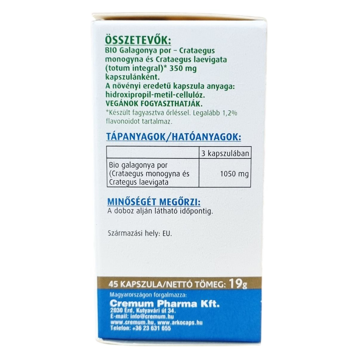 A termék bio galagonya porból készül, amely Crataegus monogyna és Crataegus laevigata növényeket tartalmaz totum integral arányban. Készült fagyasztva őrléssel, legalább 1,2% flavonoidot tartalmaz. A kapszula anyaga hidroxipropil-metil-cellulóz, amely növényi eredetű. A termék 100%-ban természetes összetevőkből áll és megfelel bio mezőgazdasági előírásoknak, származási helye az Európai Unió. Nettó tömege 19 gramm, 45 kapszulát tartalmaz. Magyarországon a Cremum Pharma Kft. forgalmazza.