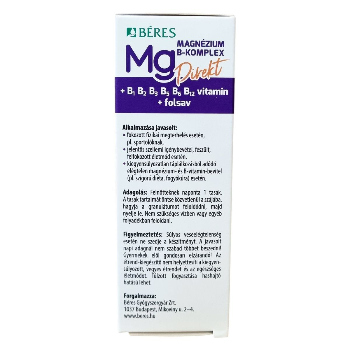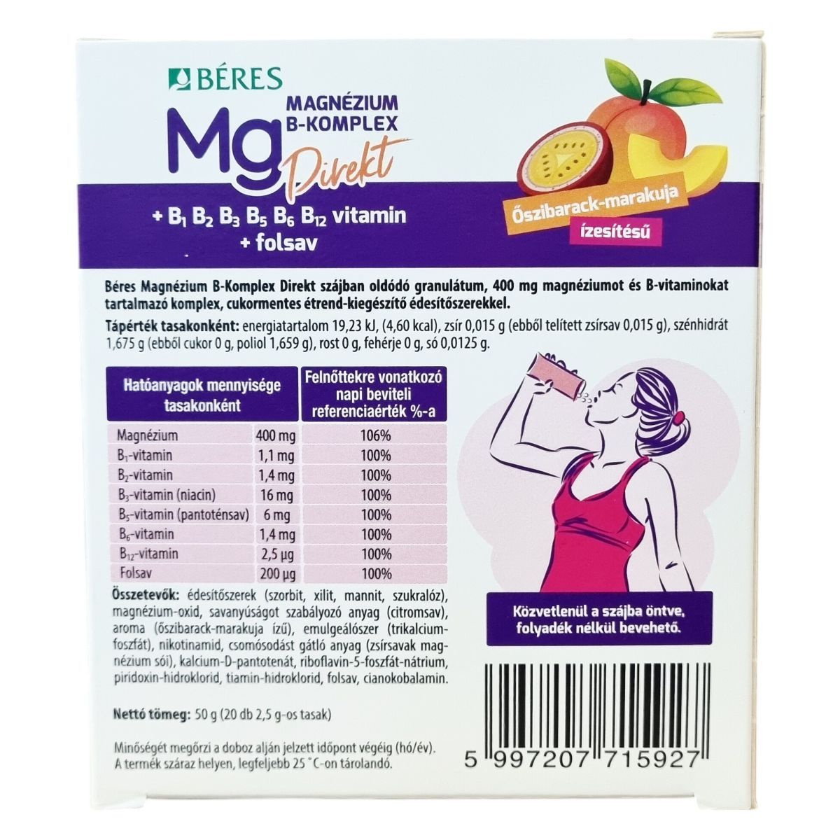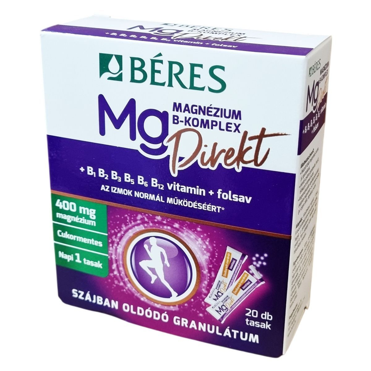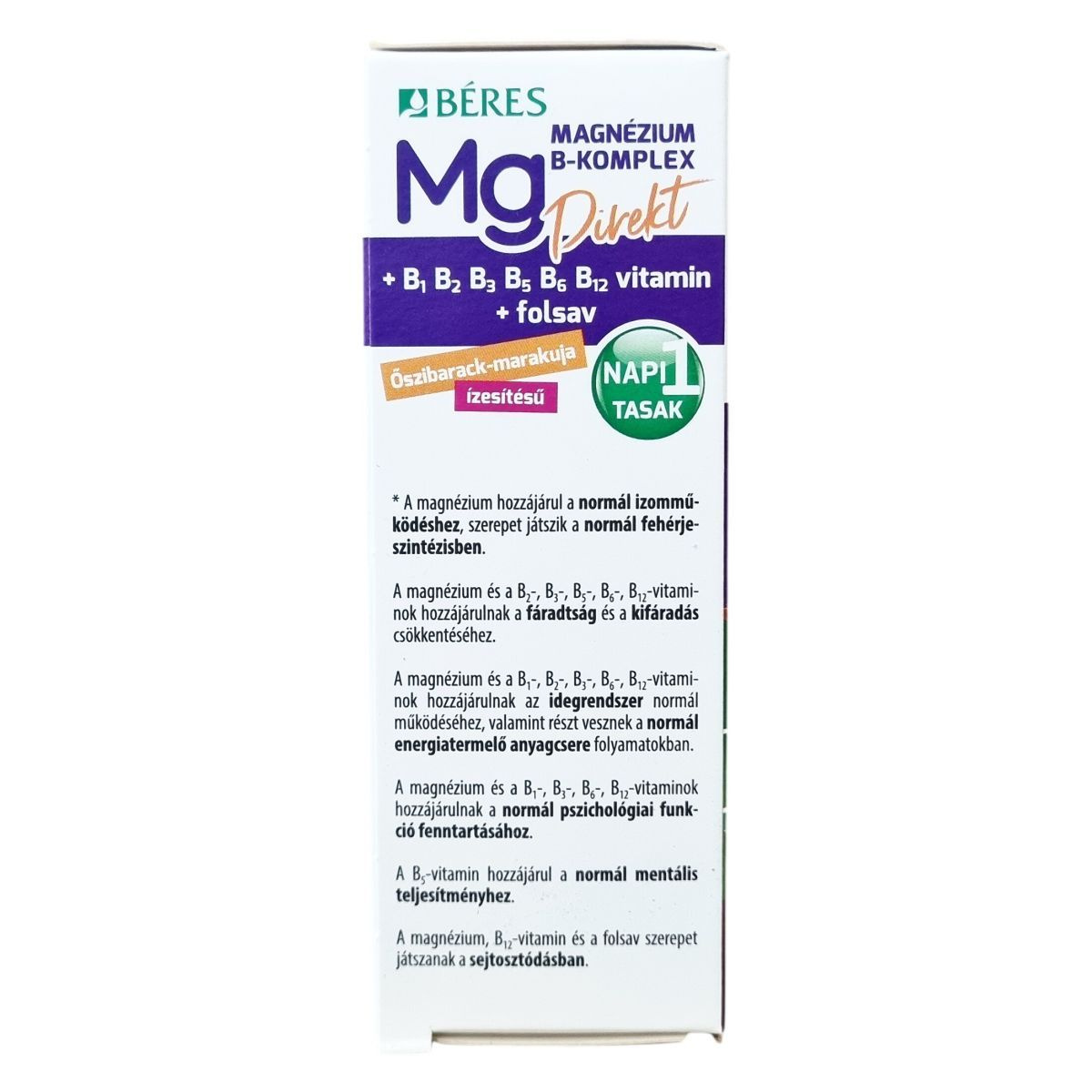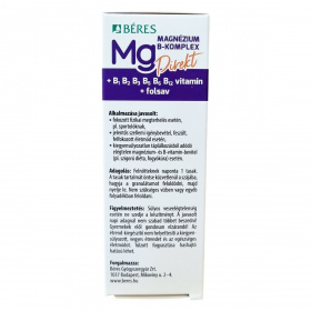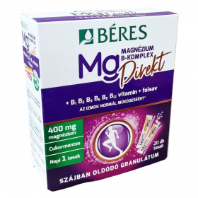 A Béres Magnézium B-Komplex Direkt egy Őszibarack-marakuja ízesítésű, szájban oldódó granulátum, amely 400 mg magnéziumot és komplex B-vitaminokat tartalmaz. A magnézium szerepet játszhat a normál izomműködésben és a fehérjeszintézis folyamatában. Emellett a magnézium és a B-vitaminok hozzájárulhatnak a fáradtság és kifáradás csökkentéséhez, az idegrendszer normál működésének támogatásához, valamint a normál energiatermelő anyagcsere folyamatok fenntartásához. Ezek a vitaminok továbbá segíthetik a pszichológiai funkciók fenntartását, a B5-vitamin pedig a mentális teljesítményt támogathatja. A magnézium, a B12-vitamin és a folsav szerepet játszhatnak a sejtosztódás folyamatában is. A termék alkalmazása javasolt fokozott fizikai megterhelés, jelentős szellemi igénybevétel vagy kiegyensúlyozatlan táplálkozás esetén, például szigorú diéta vagy fogyókúra idején. A tasak tartalma közvetlenül a szájba öntve, víz nélkül bevehető, egy praktikus, cukormentes étrend-kiegészítő készítmény.