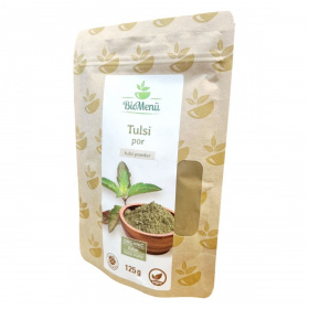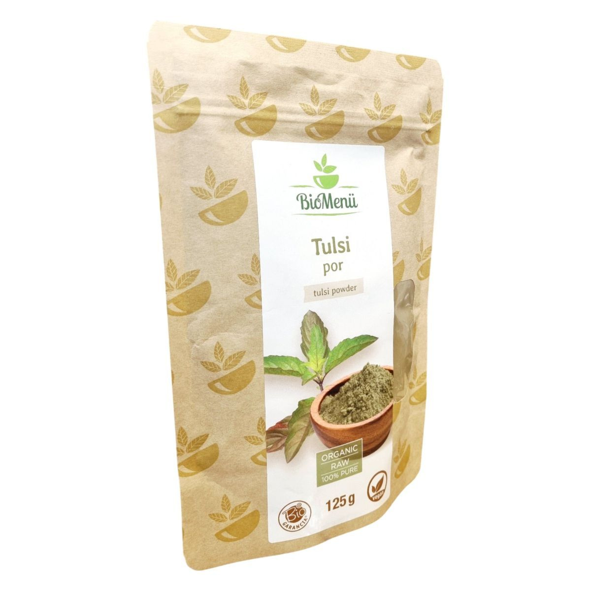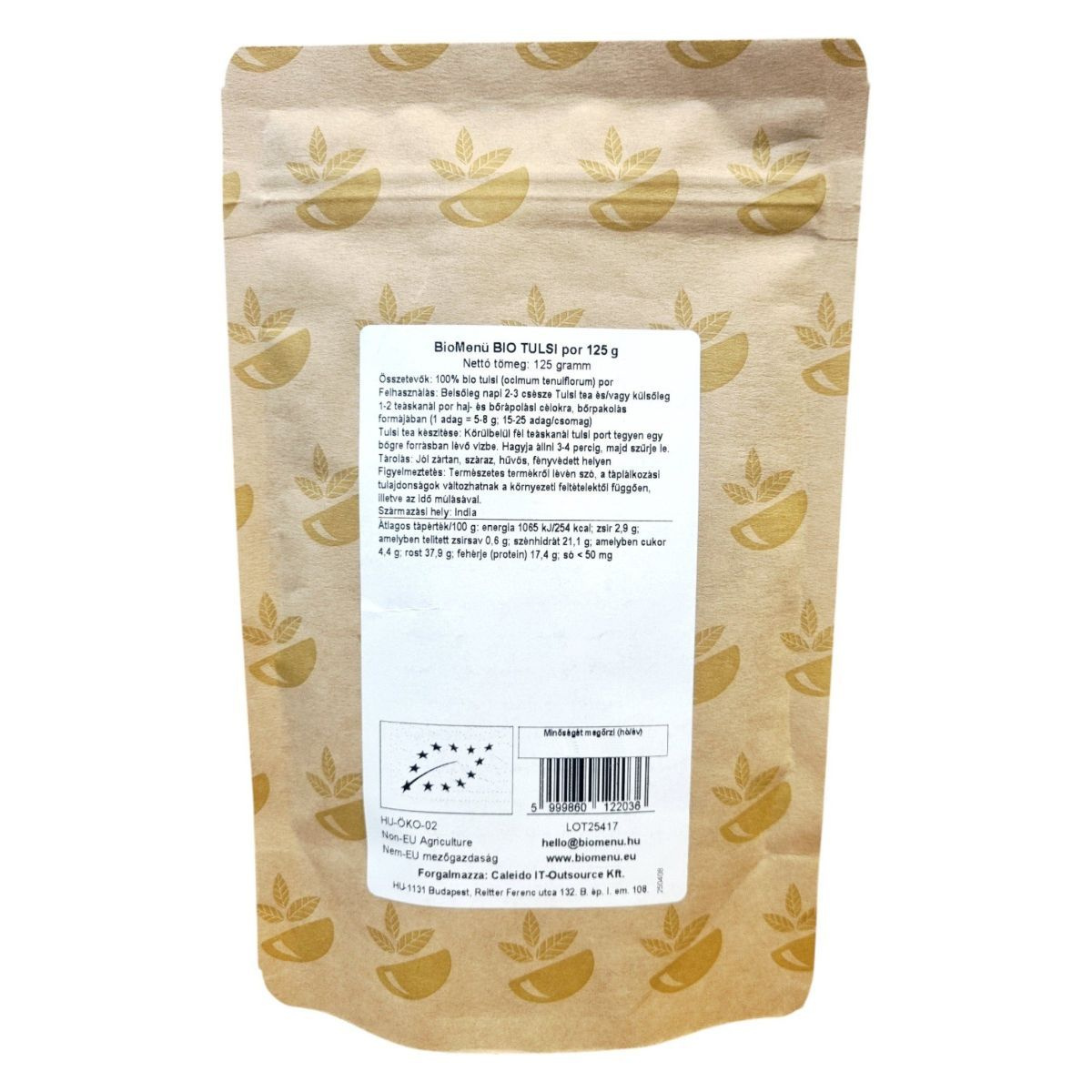A BioMenü BIO TULSI por egy 100% tiszta, organikus termék, amelyet Indiából származó tulsi növényből készítenek. A termék bio, raw és vegán minősítéssel rendelkezik, és különféle felhasználási módjai lehetnek. Belsőleg tea formájában fogyasztható, míg külsőleg haj- és bőrápolásra alkalmazható. Az ajánlott napi adagolás 2-3 csésze tea, vagy 1-2 teáskanál por külső használatra. A termék táplálkozási tulajdonságai változhatnak a környezeti feltételektől függően, ezért fontos a megfelelő tárolás. A termék HU-ÖKO-02 tanúsítvánnyal rendelkezik, és a Caleido IT-Outsource Kft. forgalmazza.