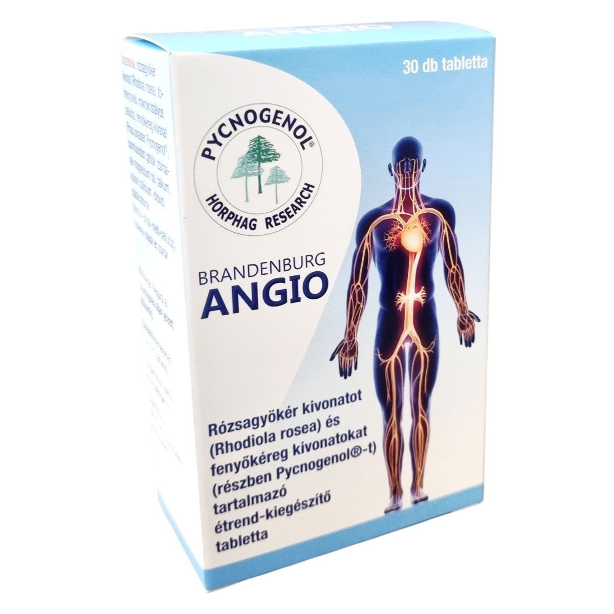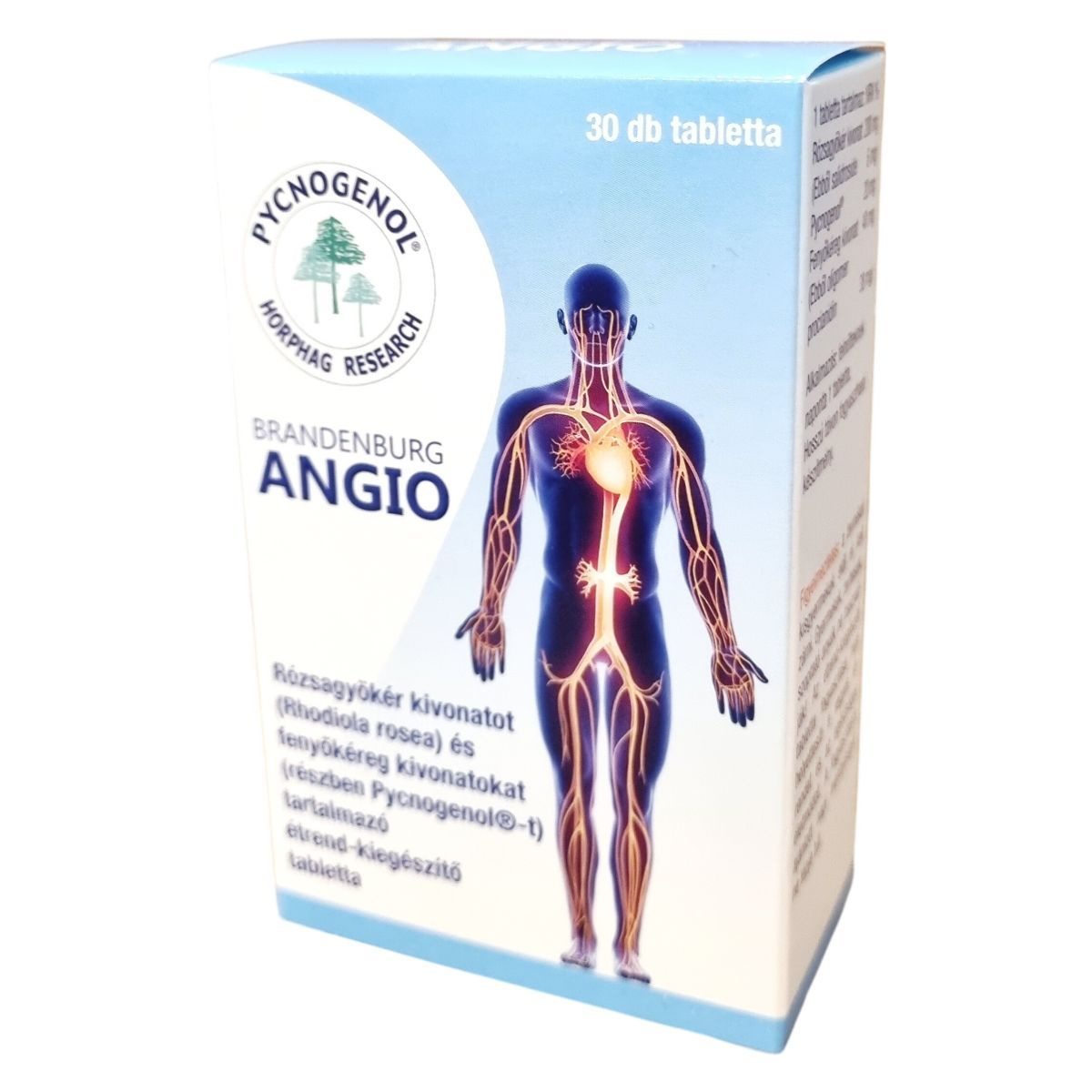 A BRANDENBURG ANGIO tabletta rózsagyökér (Rhodiola rosea) és fenyőkéreg kivonatokat (Pinus pinaster), valamint Pycnogenol®-t tartalmaz. A rózsagyökér adaptogén gyógynövény, amely segítheti a szervezet ellenállóképességét a stresszel és kimerültséggel szemben, és hozzájárulhat a szív és az érrendszer megfelelő működéséhez, valamint a normál vérkeringés fenntartásához. Elősegítheti a sejtek oxigénnel és tápanyagokkal való ellátását, valamint hozzájárulhat a pszichés működés, az érzelmi stabilitás és a fizikai erőnlét fenntartásához, továbbá segítheti az idegrendszer és a kognitív képességek megfelelő működését. Antioxidáns hatása révén a sejtek oxidatív stressz elleni védelmét támogatja. A fenyőkéreg kivonat hozzájárul a normál mikrocirkuláció fenntartásához és a keringési rendszer megfelelő működéséhez, valamint antioxidáns tulajdonságokkal rendelkezik. A termék összetevői között megtalálhatók többek között mikrokristályos cellulóz, csomósodást gátló anyagok és stabilizátorok, melyek biztosítják a tabletta minőségét és stabilitását.