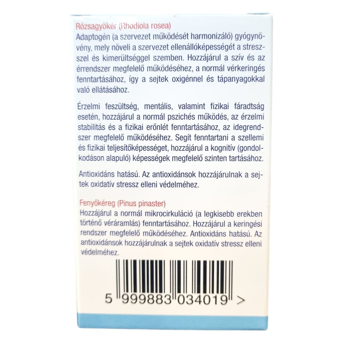rózsagyökér kivonat (Rhodiola rosea), tömegnövelő (mikrokristályos cellulóz), fenyőkéreg kivonat (Pinus pinaster), Pycnogenol®, csomósodást gátlók (zsírsavak magnézium sói, talkum, kolloid szilícium-dioxid), stabilizátorok (hidroxipropil-metil-cellulóz), növényi olajok és zsírok