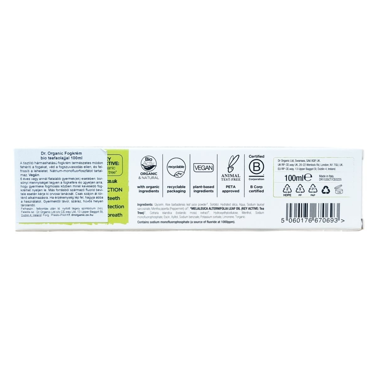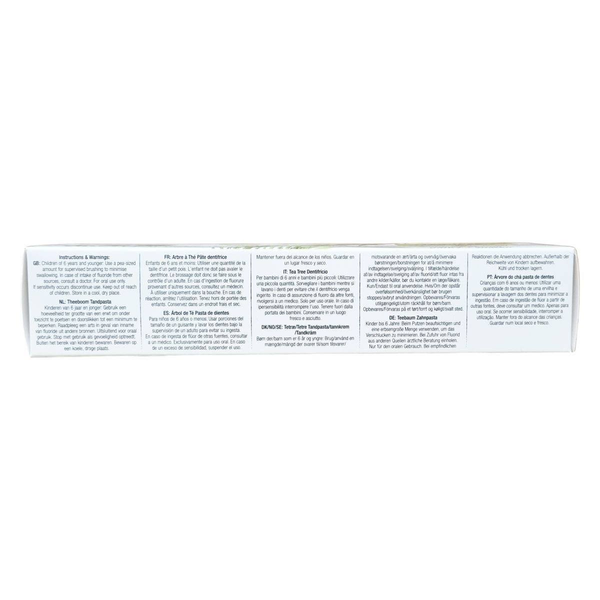 A dr.organic® TEA TREE fogkrém organikus és természetes alapanyagokból készül, és bio aktiv összetevőket tartalmaz, amelyek hozzájárulnak a fogak tisztaságához és egészségéhez. A termék újrahasznosítható csomagolásban érkezik, és állatkísérlet-mentes minősítéssel rendelkezik. A fogkrém nátrium-monofluorofoszfátot tartalmaz, amely 1000 ppm fluoridot biztosít a fogszuvasodás elleni védelemhez. A használati útmutató szerint a terméket orális használatra fejlesztették ki, és a gyermekfogmosás során szigorú felügyelet mellett alkalmazandó, különösen 6 év alatti gyermekek esetében. A termékben lévő hatóanyagok között szerepel a bio teafaolaj, mentalevél olaj, valamint izlandi zuzmó kivonat, amelyek tisztító és frissítő hatásúak. A csomagolás jelzése alapján 12 hónapig használható a felbontás után. A gyártás helye Olaszország.