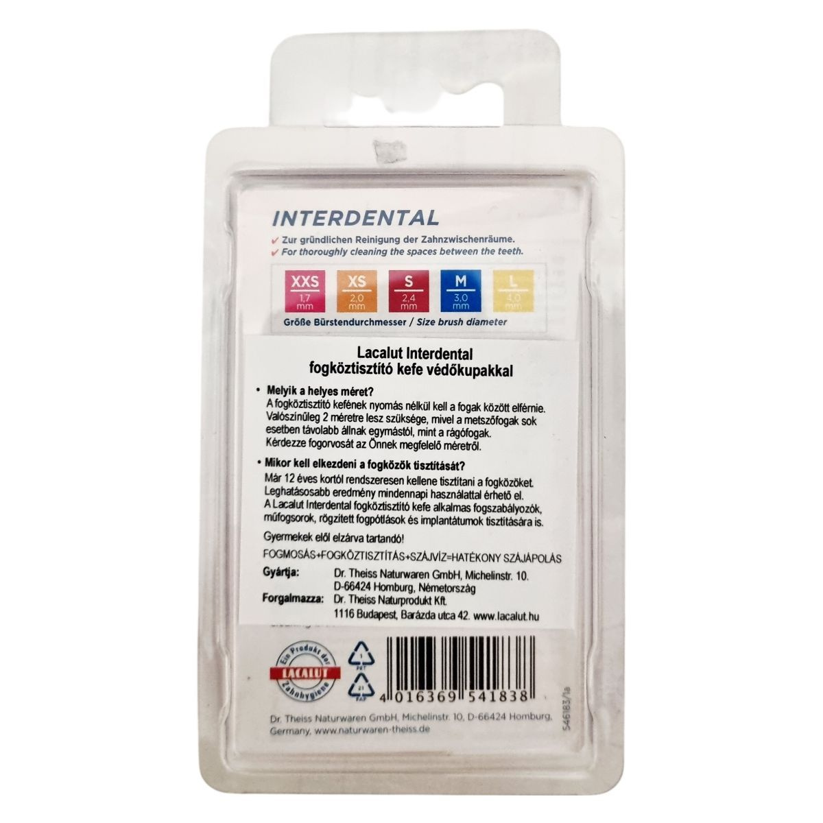 A Lacalut Interdental fogköztisztító kefe 1,7 mm-es XXS méretben kapható, amely a legkisebb fogközök tisztítására alkalmas. A termék gumínyvédő réteggel rendelkezik, hogy megóvja az ínyt a sérülésektől, és védőkupakkal van ellátva a higiénikus tárolás érdekében. A kefével a fogmosás és a fogköztisztítás hatékonyan kiegészíthető, amely a száj egészségének fenntartásához szükséges. A termék Németországban készül, és a gyártó a Dr. Theiss Naturwaren GmbH. Forgalmazója a Dr. Theiss Naturprodukt Kft., Budapest.
