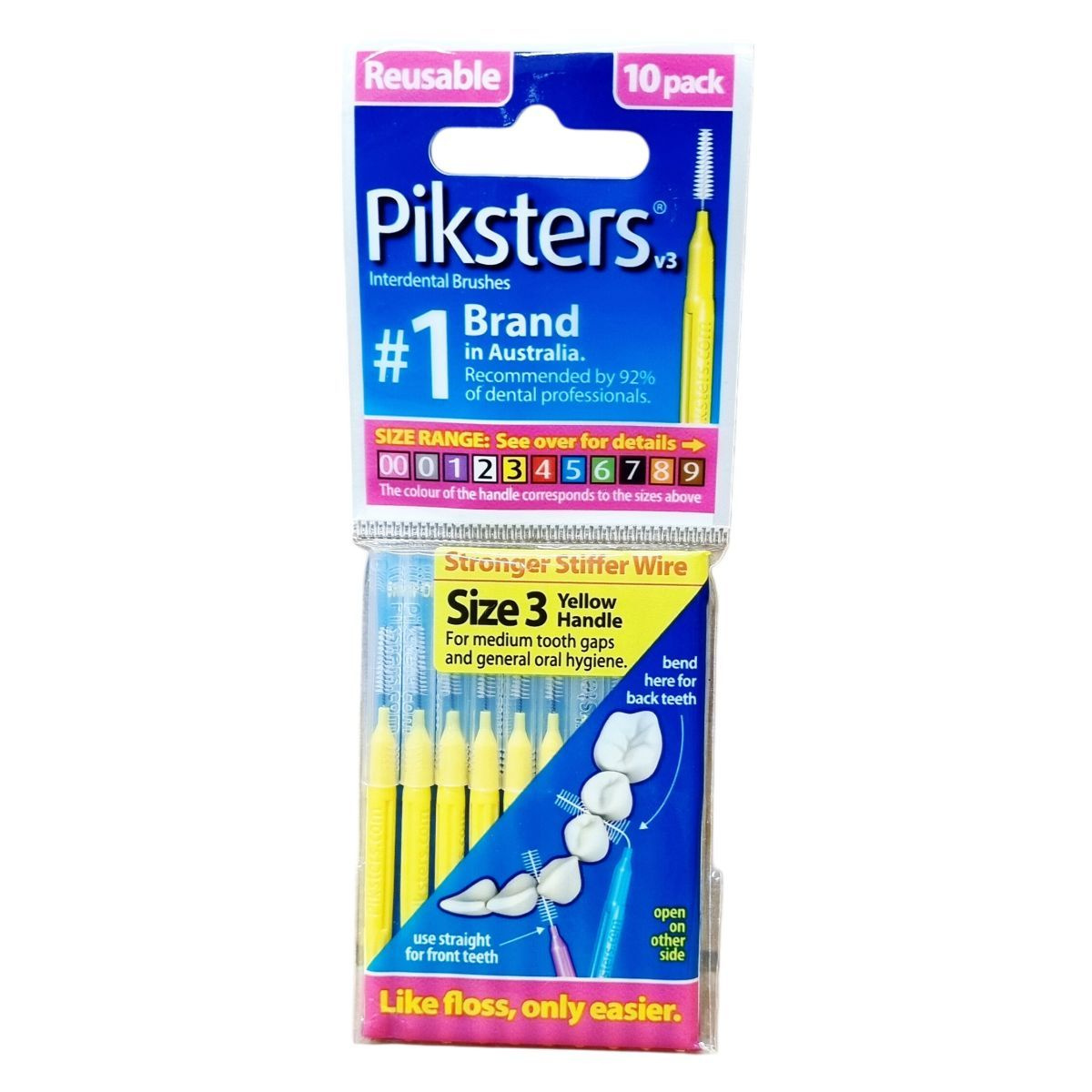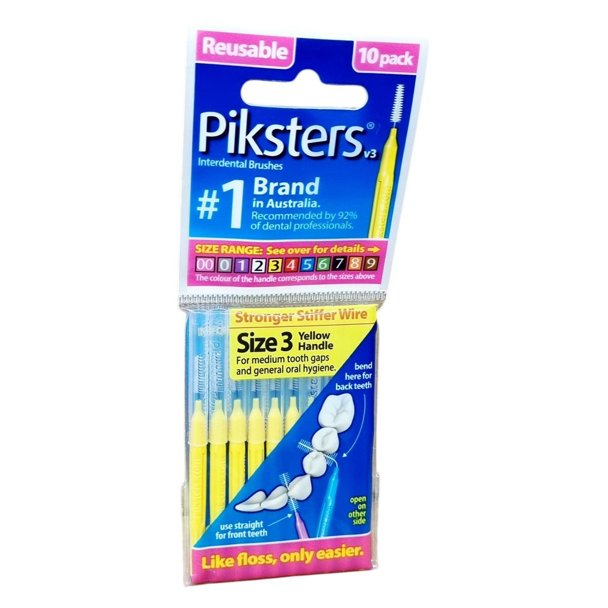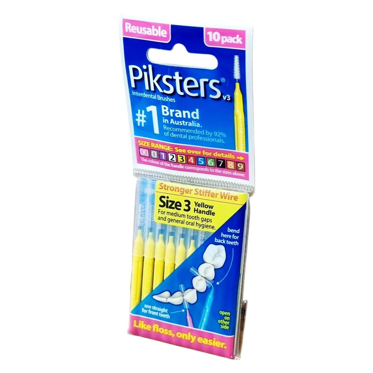 A Piksters fogköztisztító kefék Ausztráliában tervezettek, és Kínában készülnek. A csomag 10 darabot tartalmaz, melyek különböző méretekben elérhetők, a fogköztisztító kefe szára erősebb és merevebb drótból készült, így nem hajlik el használat közben. A méret szerinti színes fogantyú könnyíti a megfelelő választást. A kefék kiváltják vagy kiegészítik a fogselyem használatát, könnyebb használhatóságot biztosítva, különösen a hátsó fogakhoz való hozzáférésnél. A termék az ausztrál márka első számú terméke, melyet több mint 90% fogászati szakember javasol, és praktikus megoldást nyújt a napi szájápolásban.