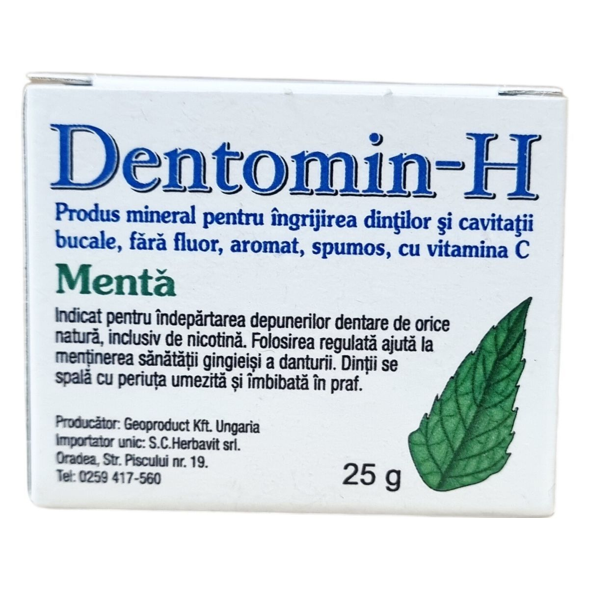 A Dentomin-H menta ízesítésű, fluort nem tartalmazó ásványi fogpor, amely rendszeres használattal támogatja a fogak és az íny egészségét. Különösen ajánlott a dohányzás miatt elszíneződött fogak tisztítására és a fogkő eltávolítására. A termék habzó, így alapos tisztítást biztosít. Tartalmaz továbbá C vitamint, amely hozzájárulhat a szájüreg egészségéhez. A fogmosás során a nedves fogkefét a porba mártva használjuk, majd a száj alapos öblítésével zárjuk a folyamatot. A csomagolás 25 gramm fogport tartalmaz.