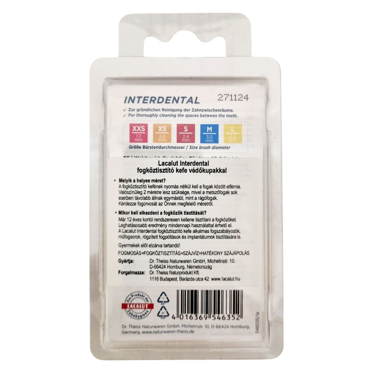 A Lacalut Interdental különböző méretű keféket kínál az optimális fogköztisztításhoz: XXS (1,7 mm), XS (2,0 mm), S (2,4 mm), M (3,0 mm), L (4,0 mm). A termékhez védőkupak is tartozik, amely megóvja a kefét használaton kívül. A hatékony fogmosás, fogköztisztítás és szájvíz használat kombinációja eredményezi a legjobb szájápolási eredményt. A termék német gyártású, és az egészséges fogíny védelmét szolgálja.