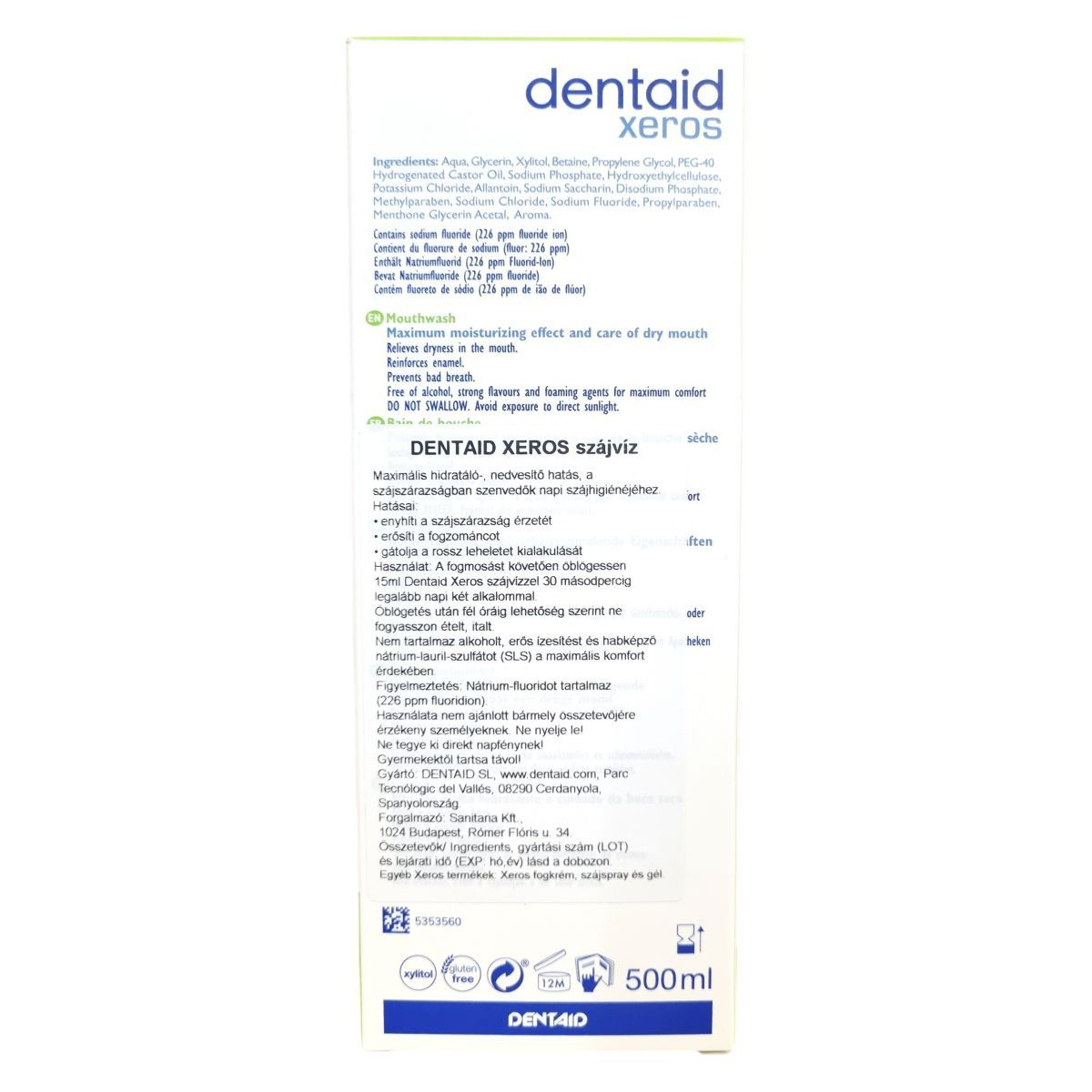A Dentaid Xeros szájvíz speciálisan a szájszárazságban szenvedők számára készült, amely enyhíti a szájszárazság érzetét, erősíti a fogzománcot, és gátolja a rossz lehelet kialakulását. Alkohol-, erős ízesítés- és habképző anyag (nátrium-lauril-szulfát, SLS) mentes, ezáltal maximális komfortot nyújt. Termék xilitolt tartalmaz, gluténmentes, és 12 hónapig használható a csomagolás felbontása után.