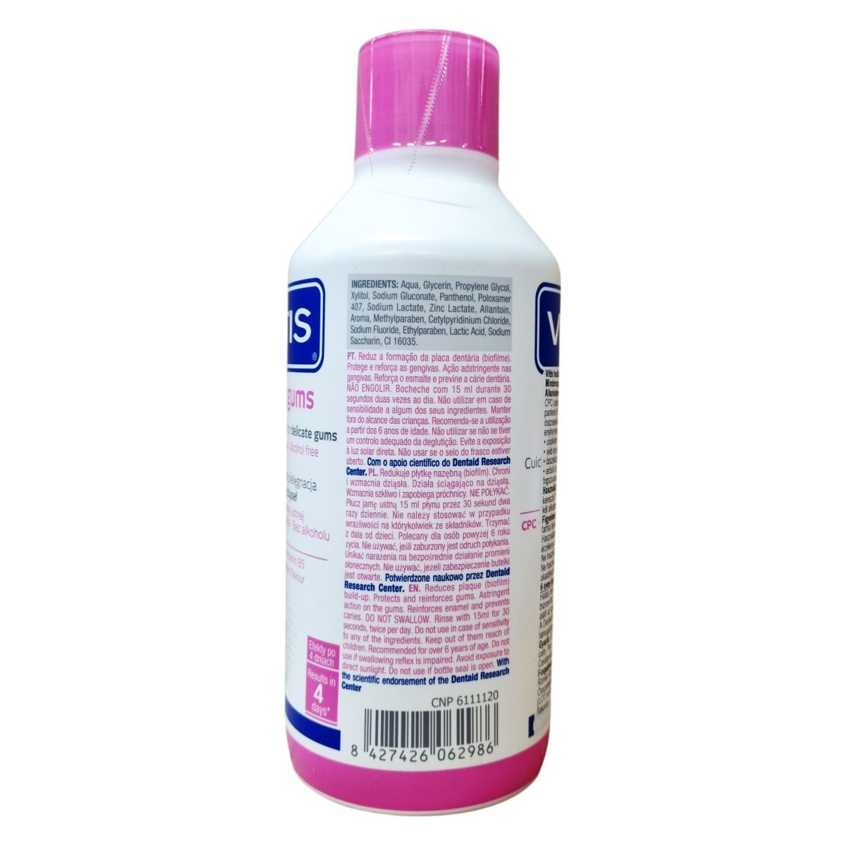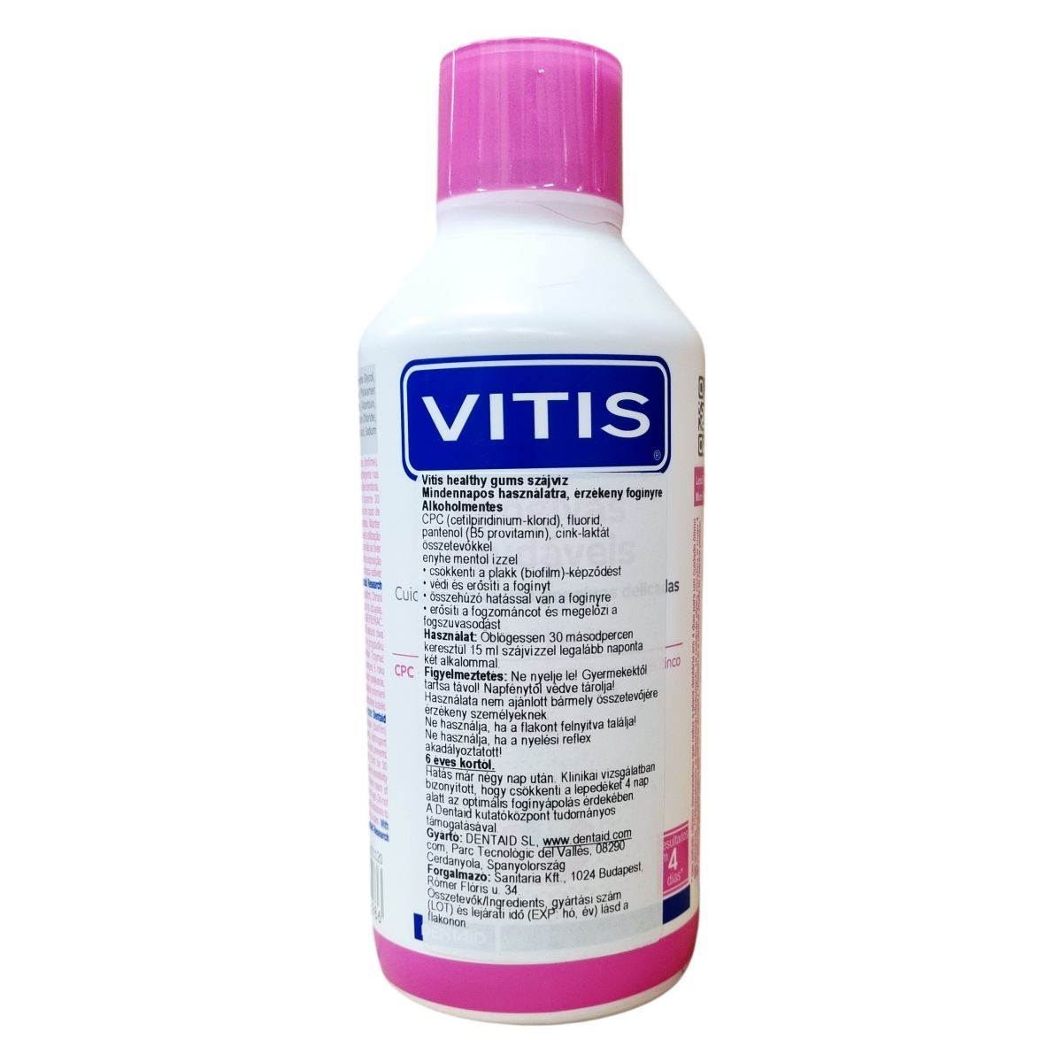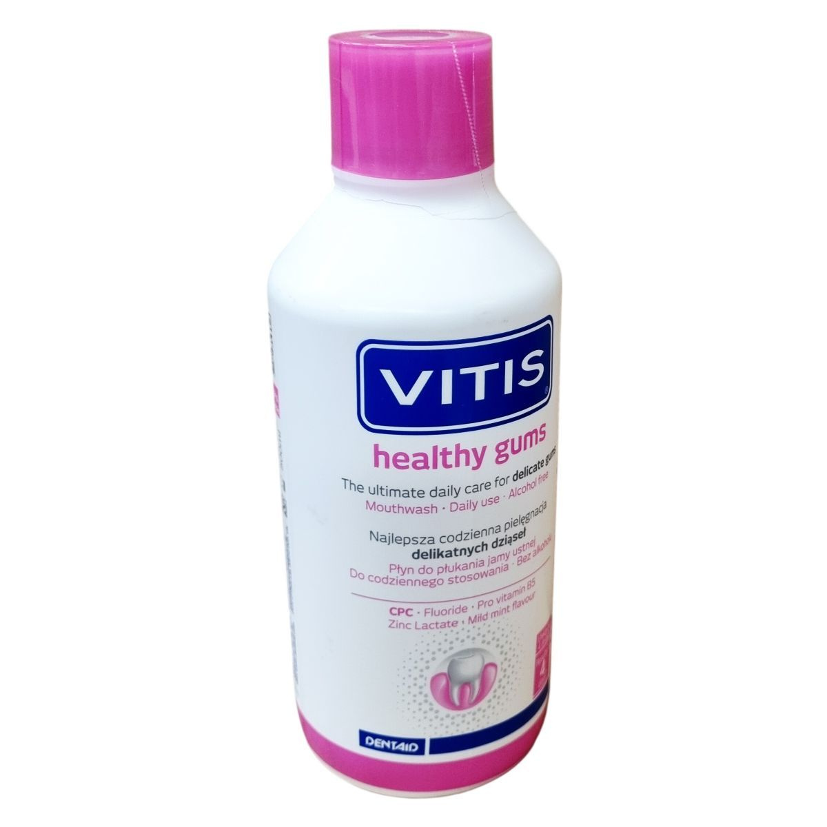 A Vitis healthy gums szájvíz mindennapos használatra készült érzékeny fogínyre. A termék csökkenti a plakk (biofilm) képződést és védi a fogínyt, összehúzó hatású, valamint erősíti a fogzománcot, ezáltal segít megelőzni a fogszuvasodást. Klinikailag igazolt, hogy már négy nap alatt csökkenti a lepedéket. Használata során 15 ml szájvizet kell 30 másodpercig öblögetni naponta legalább kétszer. Nem ajánlott érzékenység vagy nyelési nehézség esetén. A termék a Dentaid Kutatóközpont tudományos támogatásával készült, alkoholmentes és enyhe mentol ízzel rendelkezik. Kiszerelése 500 ml, gluténmentes, fluort tartalmaz. A termék gyártója a DENTAID SL, Spanyolországban, az EU-ban forgalmazza a Dent-O-Care Ltd.