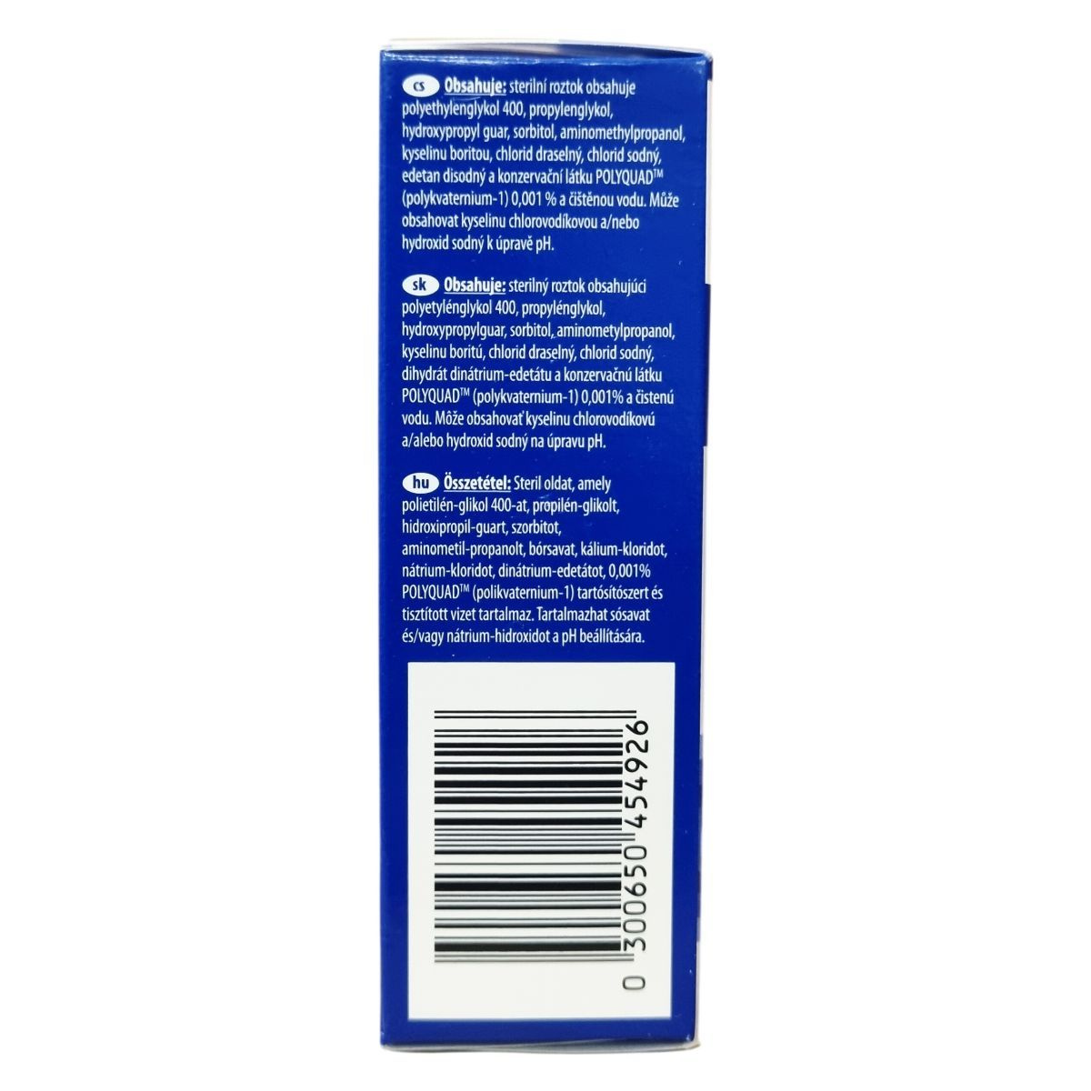 polietilén-glikol 400, propilén-glikol, hidroxi-propil-guar, szorbit, aminometil-propanol, bórsav, kálium-klorid, nátrium-klorid, dinátrium-edetát, POLYQUAD™ (polikvaternium-1) 0,001%, tisztított víz. Tartalmazhat sósavat és/vagy nátrium-hidroxidot a pH beállítására.
