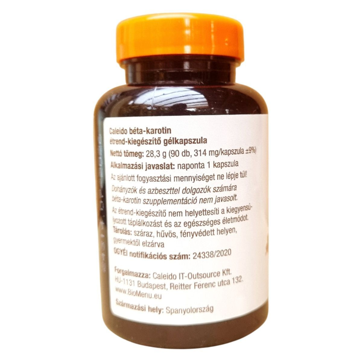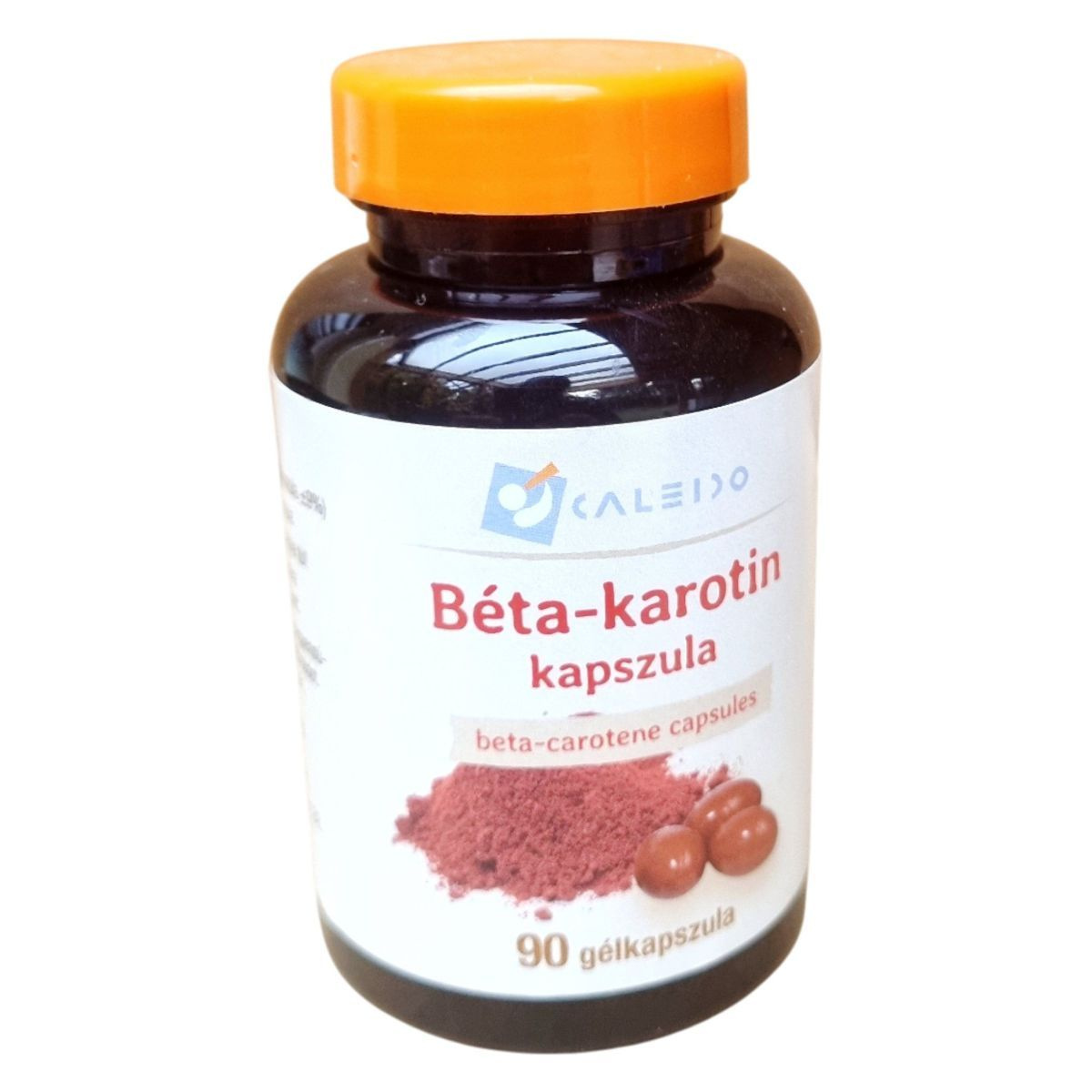 A Caleido Béta-karotin kapszula egy étrend-kiegészítő, amely béta-karotint és tokoferolt tartalmaz. A béta-karotin az A-vitamin előanyaga, amely hozzájárulhat a látás és az immunrendszer normál működéséhez. A tokoferol, mint antioxidáns, segíthet megvédeni a sejteket az oxidatív stressztől. A termék 90 gélkapszulát tartalmaz, és Spanyolországban készül. A kapszulák összetevői között megtalálható a finomított szójaolaj, zselatin, glicerin, valamint különböző színezőanyagok. A termék forgalmazója a Caleido IT-Outsource Kft., és az OGYÉI notifikációs száma 24338/2020.