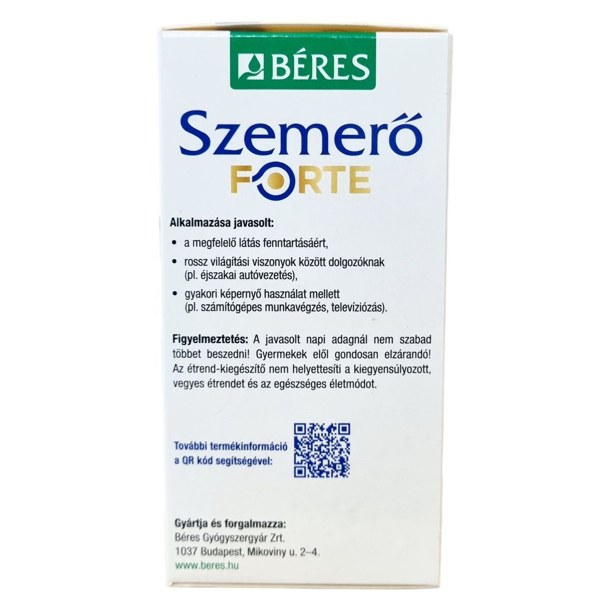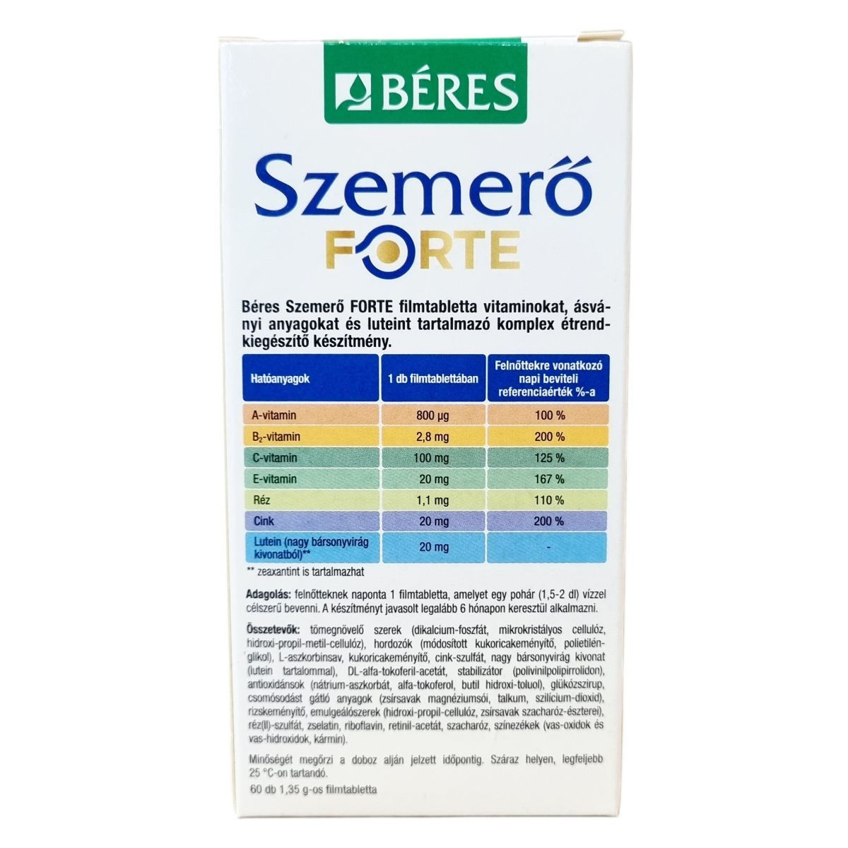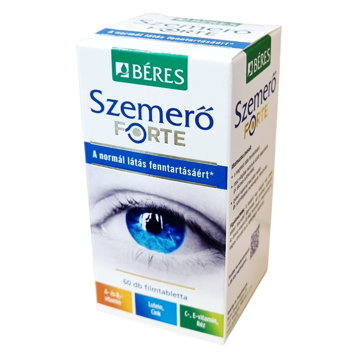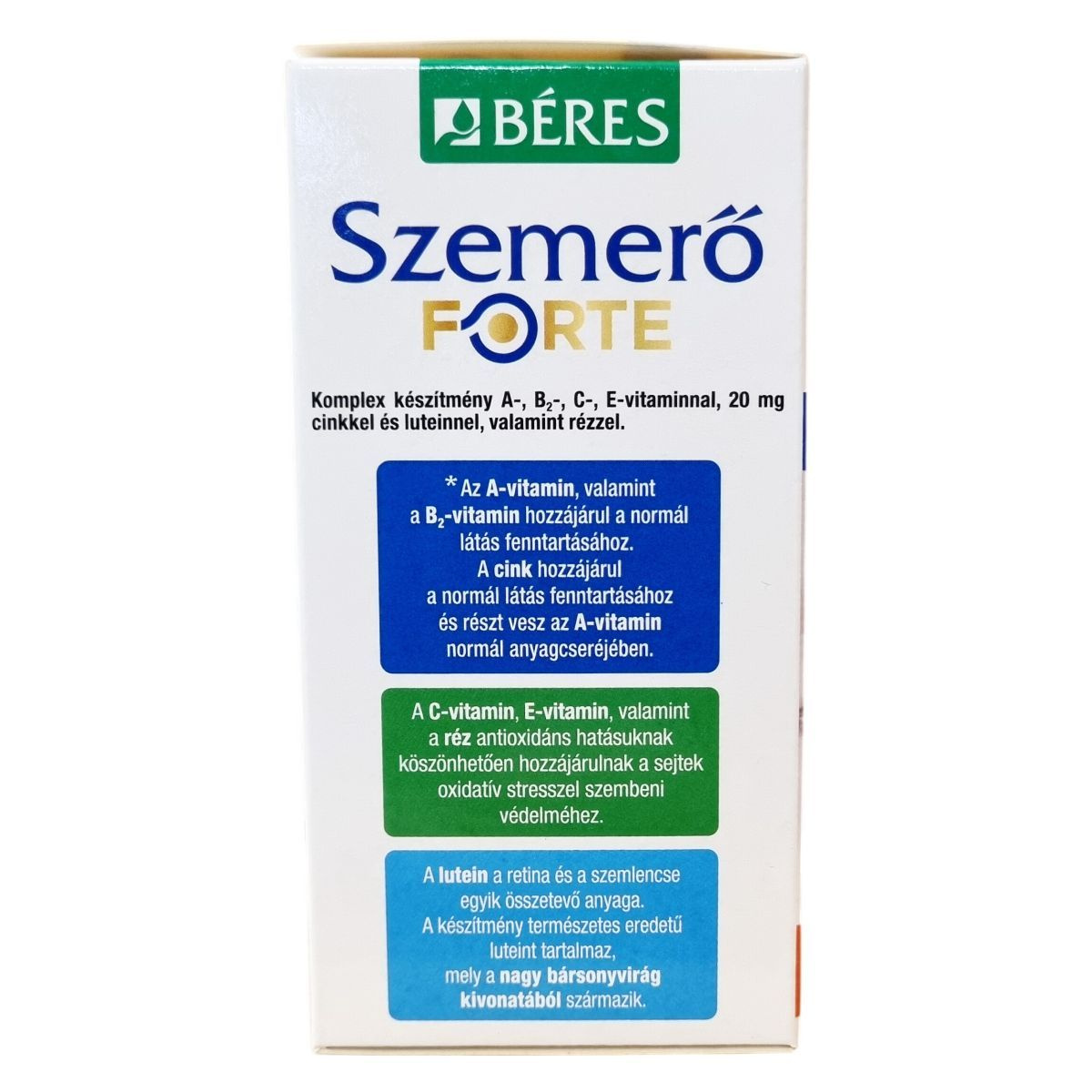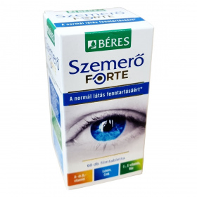 A BÉRES Szemerő FORTE komplex készítmény A-, B2-, C-, és E-vitaminokat, 20 mg cinket, luteint, valamint réztartalmat foglal magába. Az A-vitamin és a B2-vitamin hozzájárulhat a normál látás fenntartásához, míg a cink szerepet játszhat az A-vitamin normál anyagcseréjében és a látás megőrzésében. A C-vitamin, E-vitamin és a réz antioxidáns tulajdonságai révén támogathatják a sejtek oxidatív stresszel szembeni védelmét. A lutein a retina és a szemlencse fontos összetevője, amely természetes forrásból, a nagy bársonyvirág kivonatából származik, és zeaxantint is tartalmazhat. A készítmény alkalmazása javasolt a megfelelő látás fenntartására, különösen rossz világítási körülmények között dolgozóknak, valamint gyakori képernyő használat esetén. A termék filmtabletta formájában kapható és a tartós használat javasolt a hatásosság érdekében.