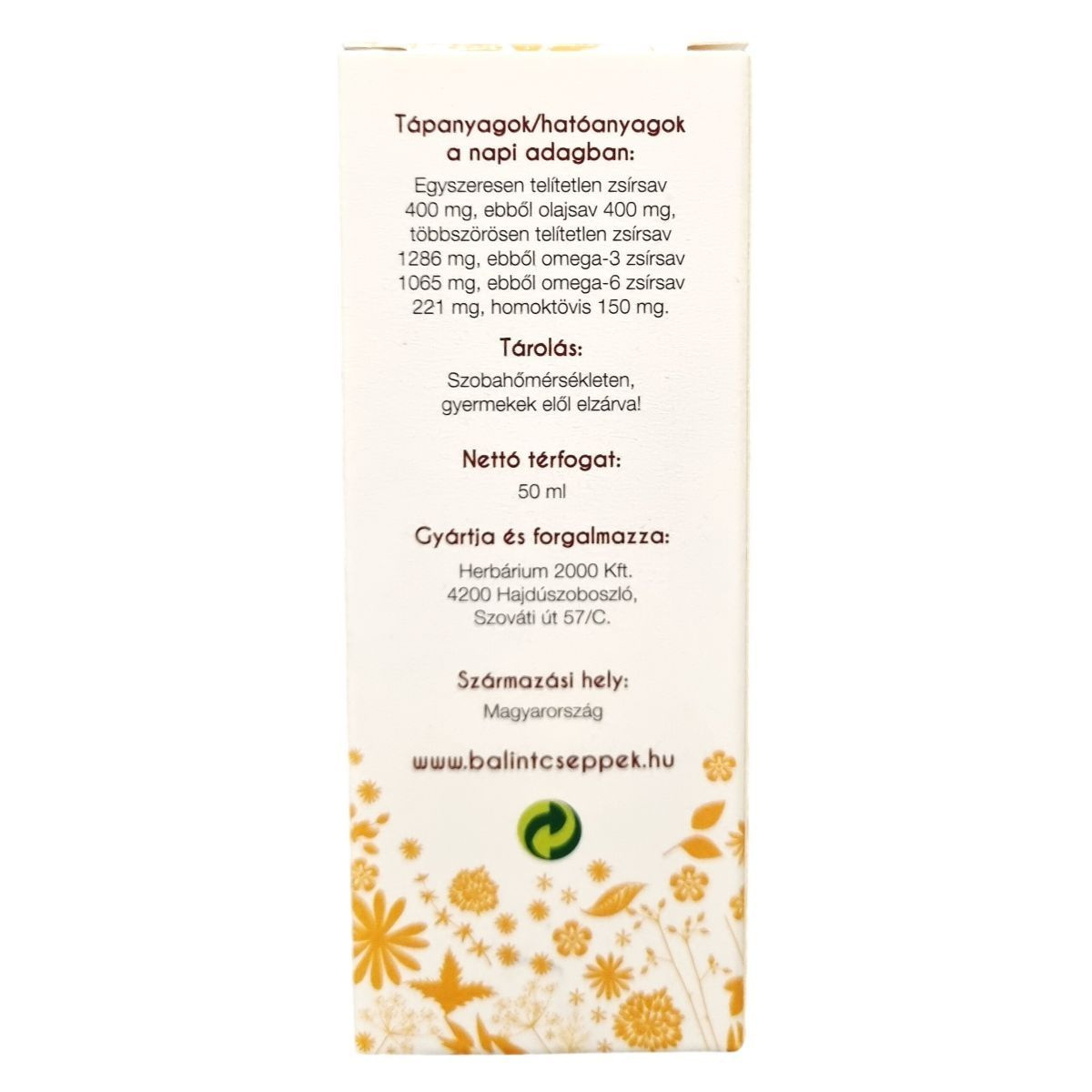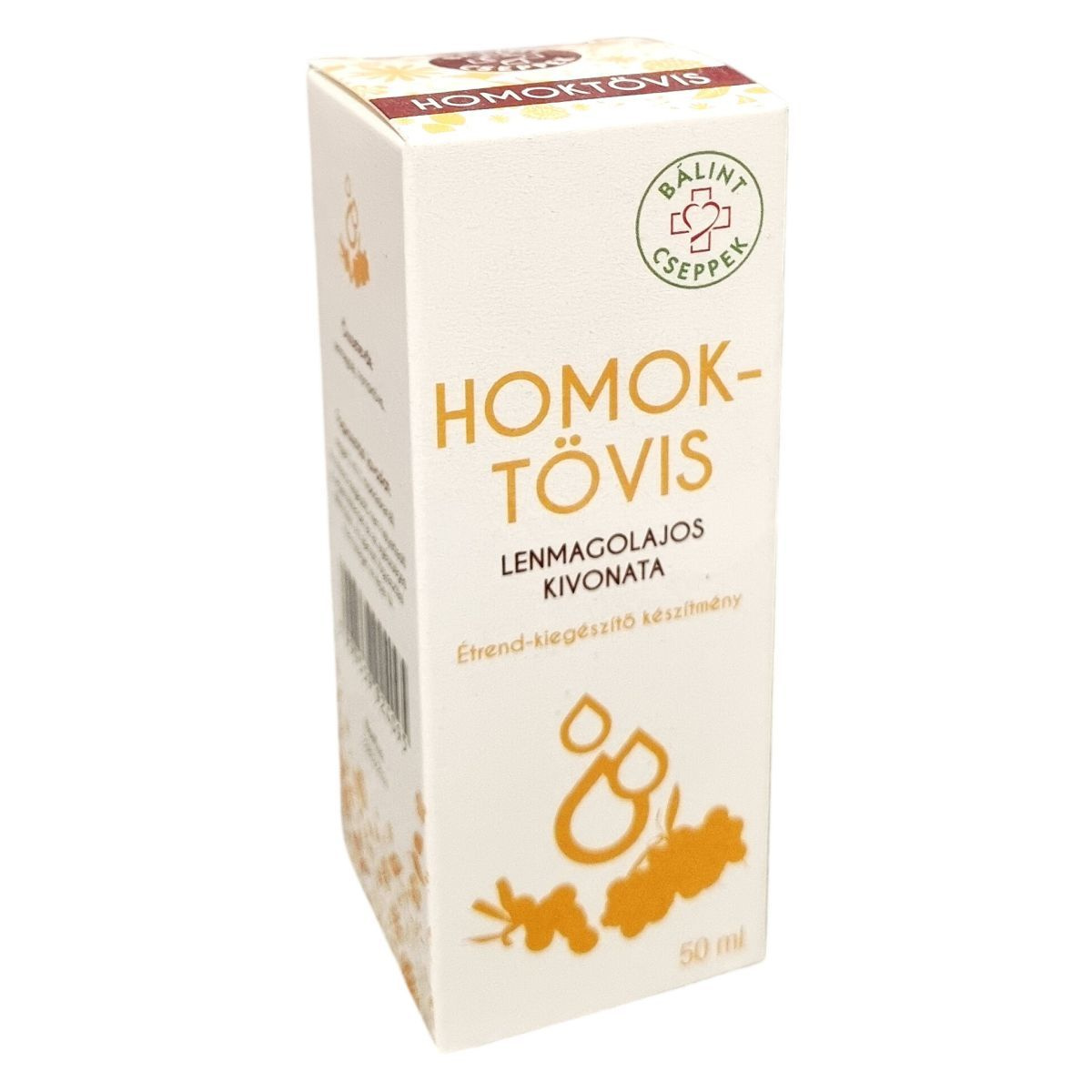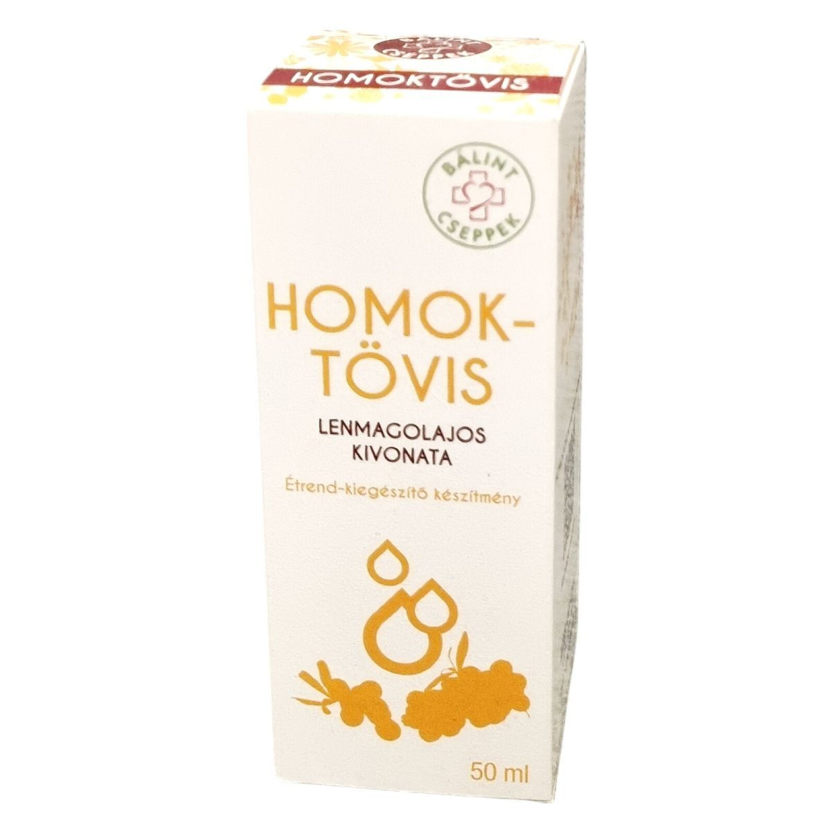 A Bálint Cseppek Homoktövis lenmagolajos kivonata 50 ml-es kiszerelésben készül Magyarországon. Természetes összetevői között lenmagolaj és homoktövis található. A termékben lévő egyszeresen és többszörösen telítetlen zsírsavak, így az omega-3 és omega-6 zsírsavak a szervezet számára fontosak lehetnek. A terméket szobahőmérsékleten kell tárolni, és gyermekektől elzárva ajánlott tartani. A fogyasztási javaslat napi 2 ml, azaz egy mokkáskanál reggelente. Az étrend-kiegészítő nem helyettesíti a vegyes étrendet és az egészséges életmódot.