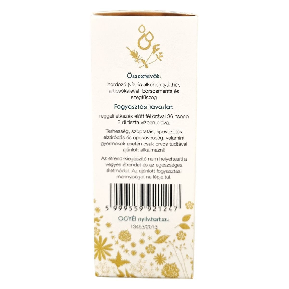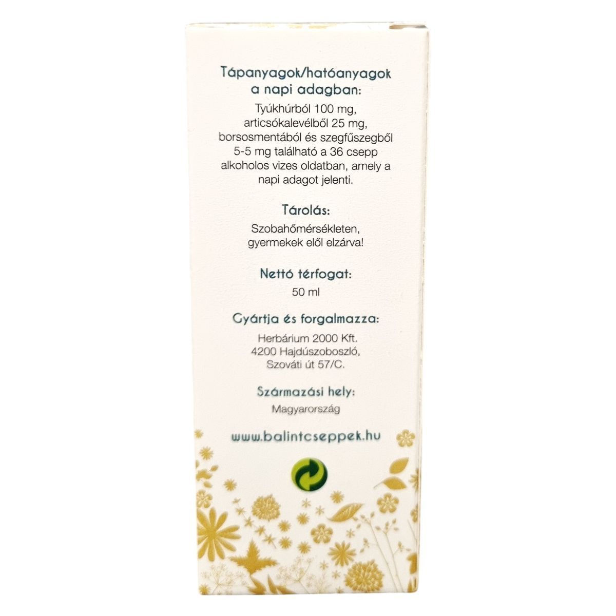 A termék 33 v/v% alkoholtartalmú vizes oldatban készül, nettó térfogata 50 ml. A napi adag 36 csepp, amely tartalmazza a tyúkhúr, articsókalevél, borsosmenta és szegfűszeg pontos mennyiségeit. A termék Magyarországon készül és forgalmazza a Herbárium 2000 Kft. Hajdúszoboszlón.