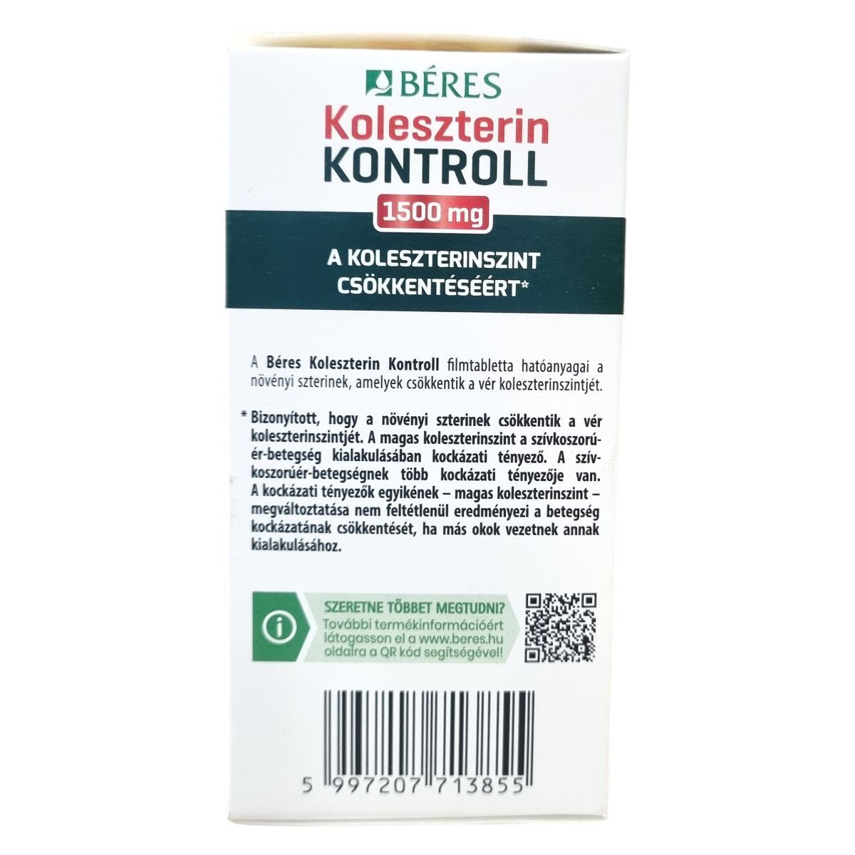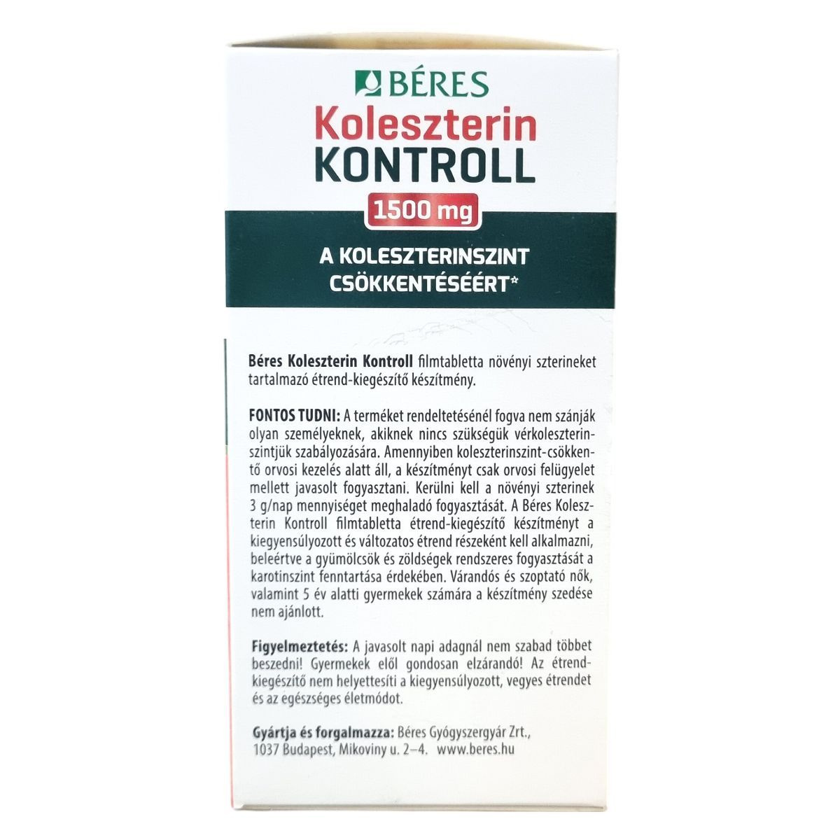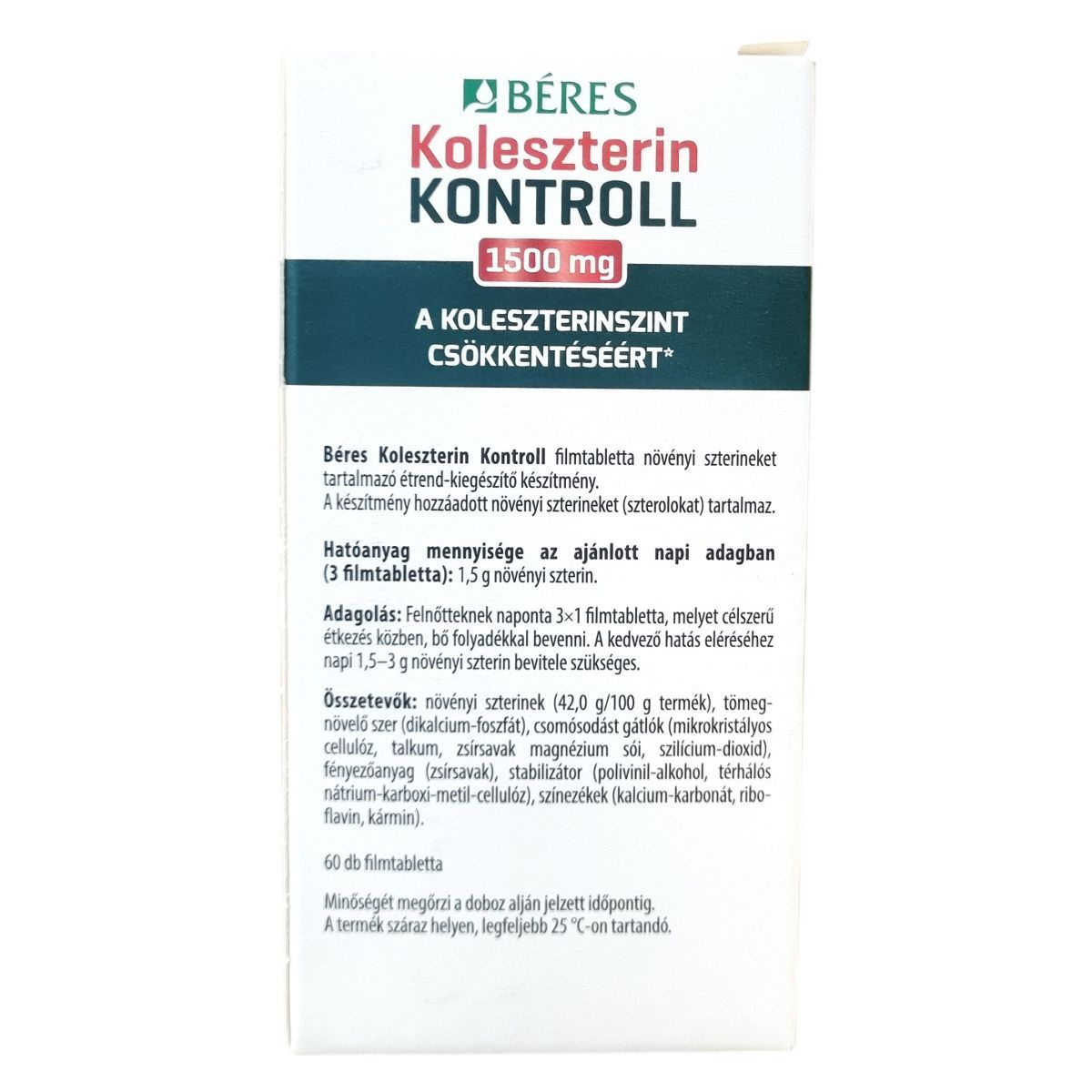 A Béres Koleszterin Kontroll filmtabletta hozzáadott növényi szterineket tartalmaz, melyek bizonyítottan csökkenthetik a vér koleszterinszintjét. A készítmény napi 1,5 g növényi szterint biztosít 3 filmtablettában, de a kedvező hatás eléréséhez napi 1,5-3 g szterin bevitele ajánlott. A magas koleszterinszint a szívkoszorúér-betegség egyik kockázati tényezője, de annak megléte önmagában nem feltétlenül csökkenti a betegség kockázatát, mivel több más tényező is közrejátszhat a kialakulásában. A készítményt kiegyensúlyozott és változatos étrend részeként, a gyümölcsök és zöldségek rendszeres fogyasztásával javasolt alkalmazni a megfelelő karotinszint fenntartása érdekében.