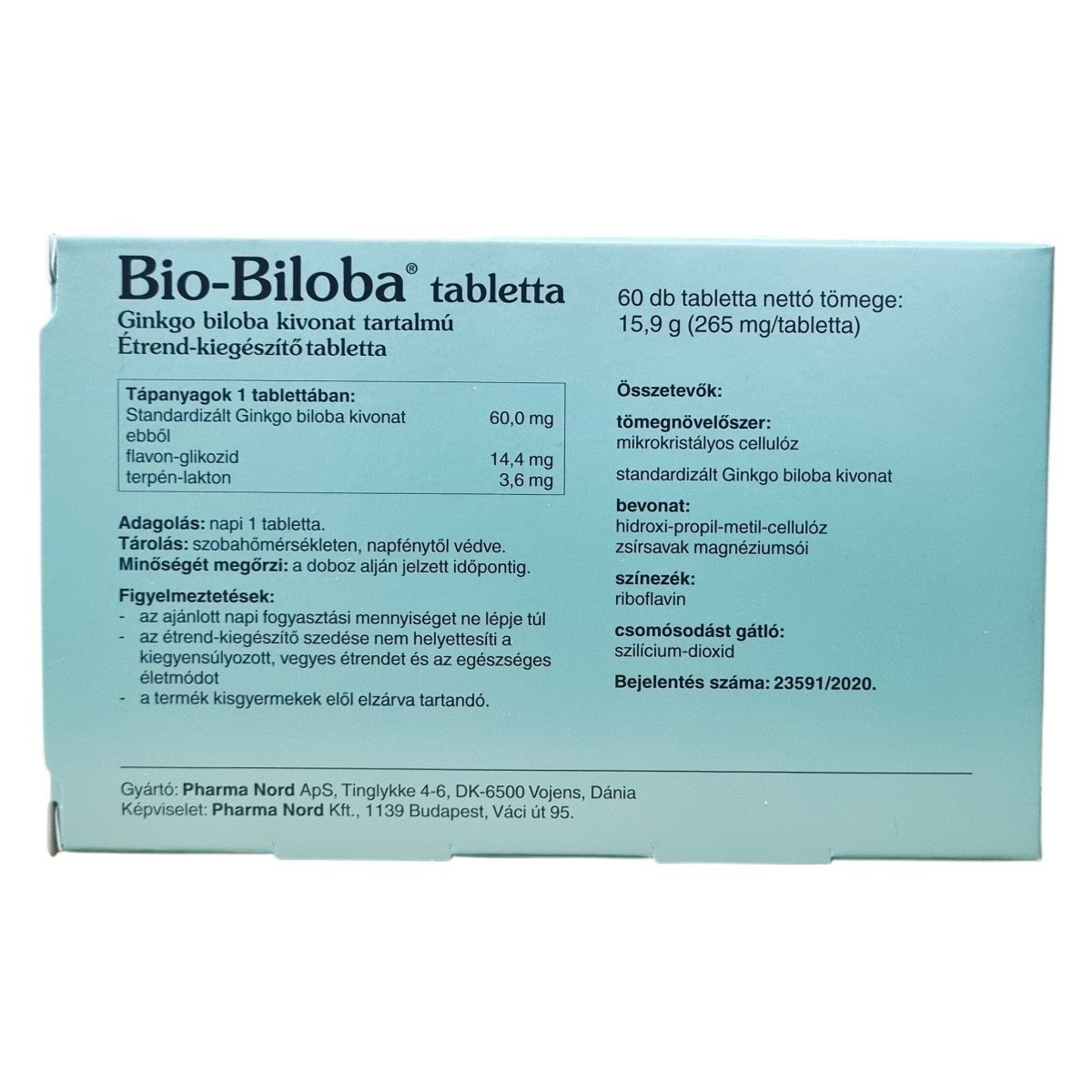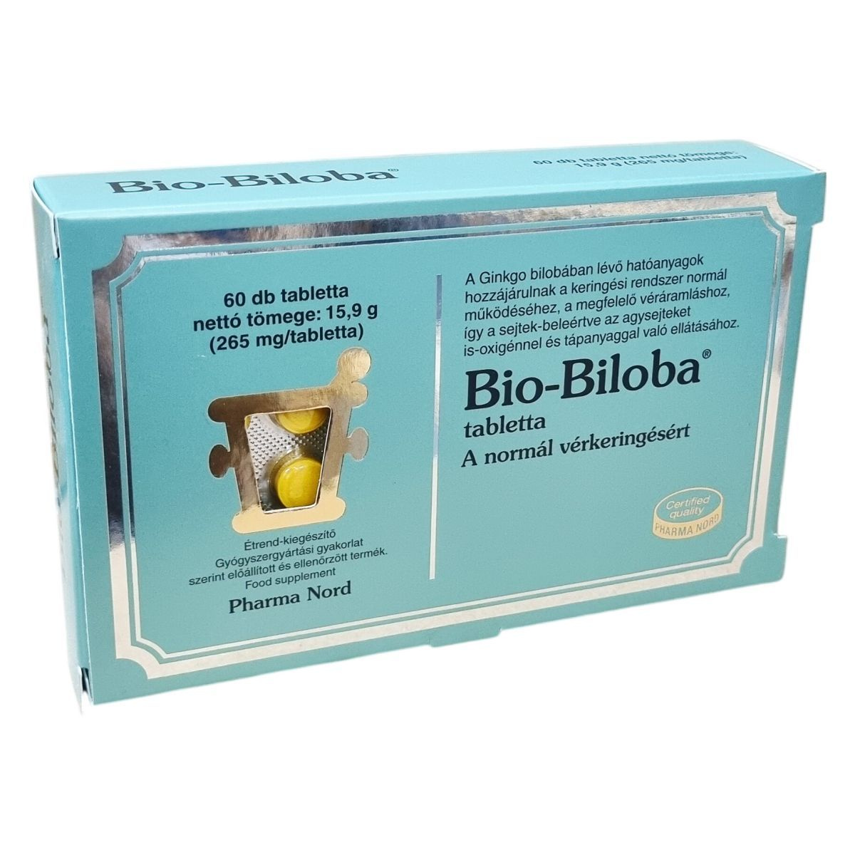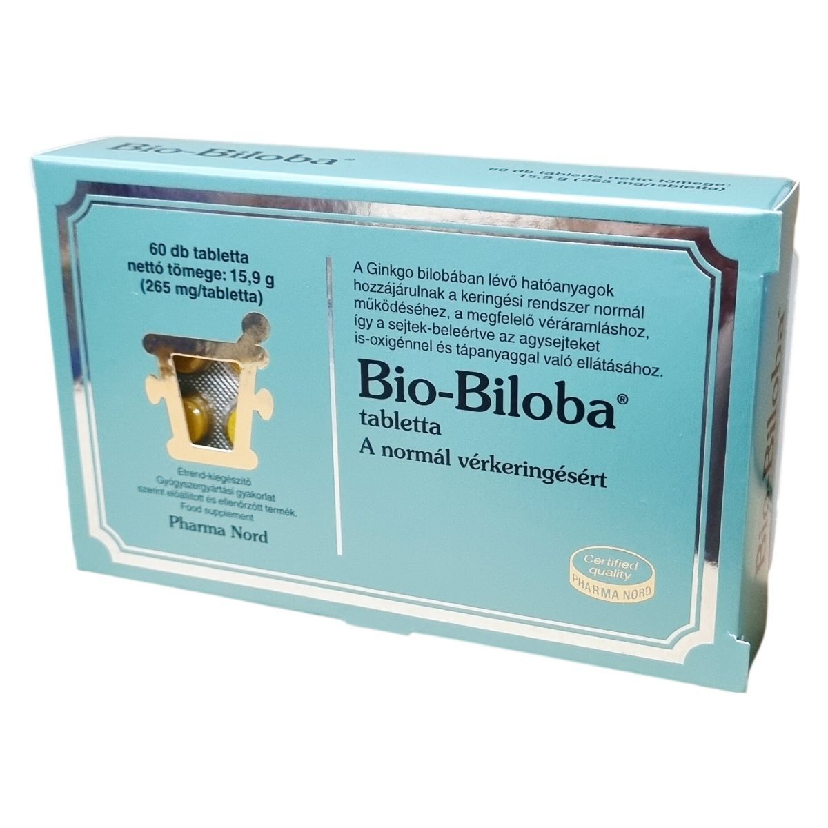 A Pharma Nord által gyógyszergyártási gyakorlat szerint előállított Bio-Biloba® tabletta 60 db-os kiszerelésben készül 265 mg-os tablettákban, amelyek standardizált Ginkgo biloba kivonatot tartalmaznak. Az összetevők között megtalálható a mikrokristályos cellulóz, hidroxi-propil-metil-cellulóz, zsírsavak magnéziumsói, riboflavin színezék és szilícium-dioxid csomósodást gátlóként. A termék a normál vérkeringésért fejlesztett étrend-kiegészítő, amely minősített Pharma Nord minőséggel rendelkezik.
