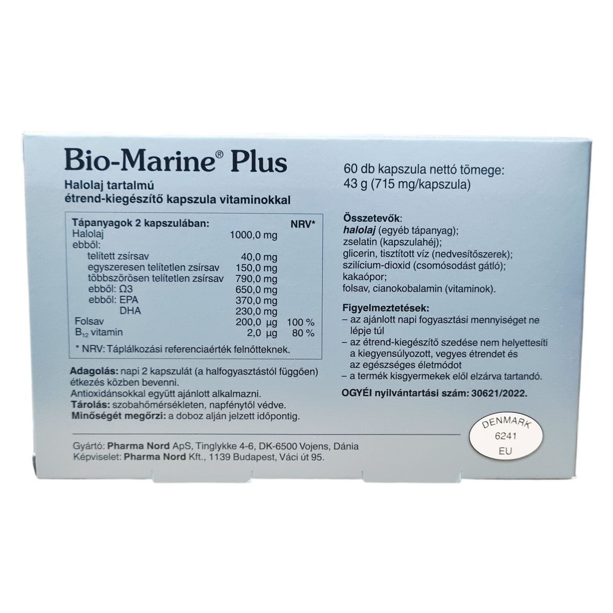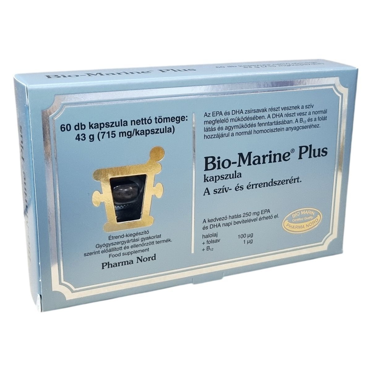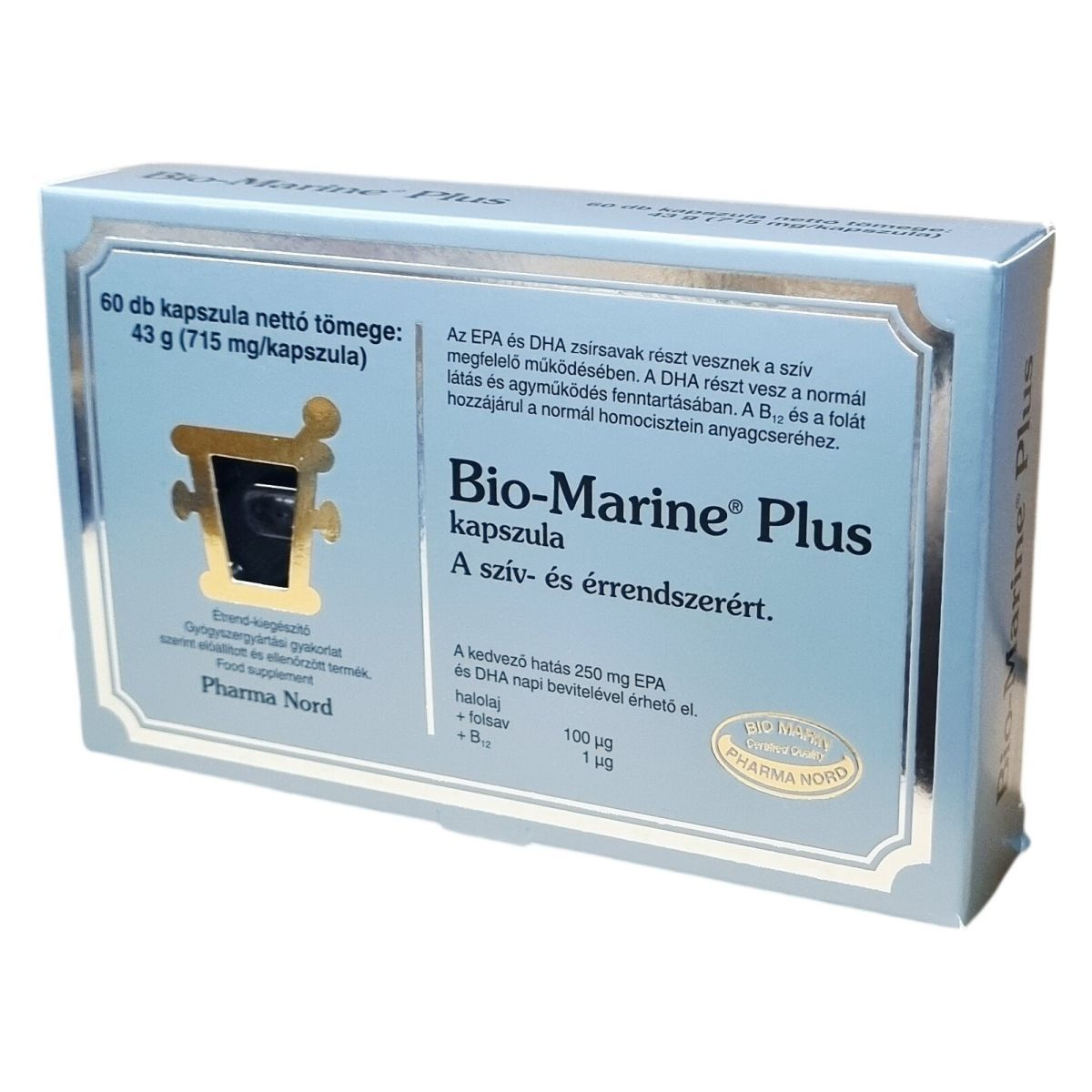 A Bio-Marine® Plus kapszula halolaj tartalmával, továbbá folsav és B12 vitamin bevitelével járulhat hozzá a szív megfelelő működéséhez, a normál látás és agyműködés fenntartásához, valamint a normál homocisztein anyagcseréhez. A termék gyógyszergyártási gyakorlat szerint előállított és ellenőrzött, minősített étrend-kiegészítő. A kapszulák antioxidánsokkal együtt alkalmazva ajánlottak. Egy kapszula nettó tömege 715 mg, a dobozban 60 darab található.