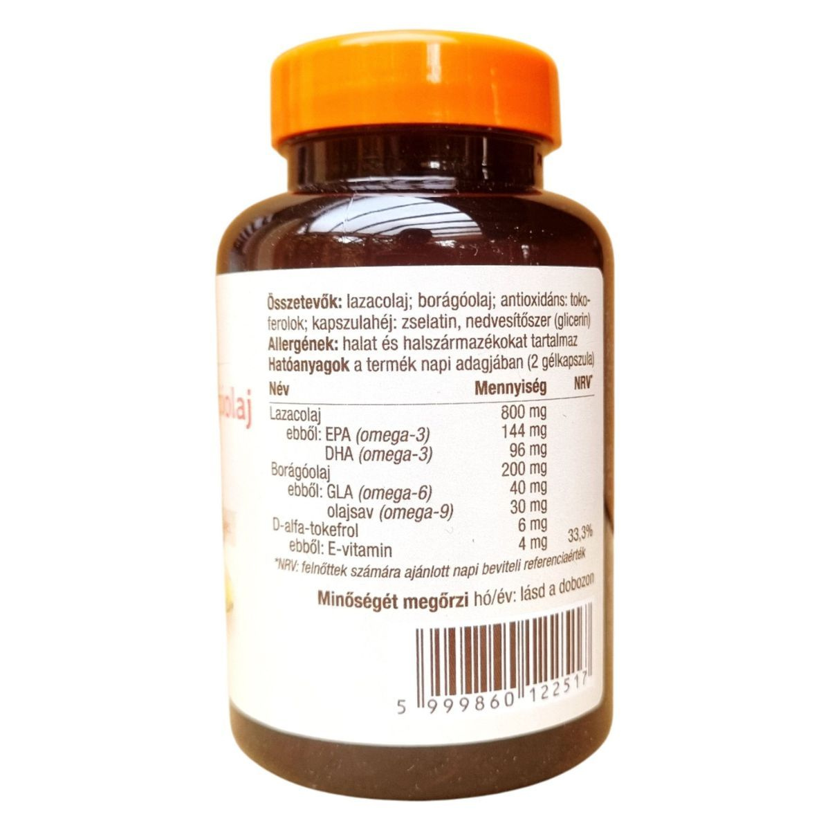 Lazacolaj, borágóolaj, antioxidáns: tokoferolok, kapszulahéj: zselatin, nedvesítőszer (glicerin)
