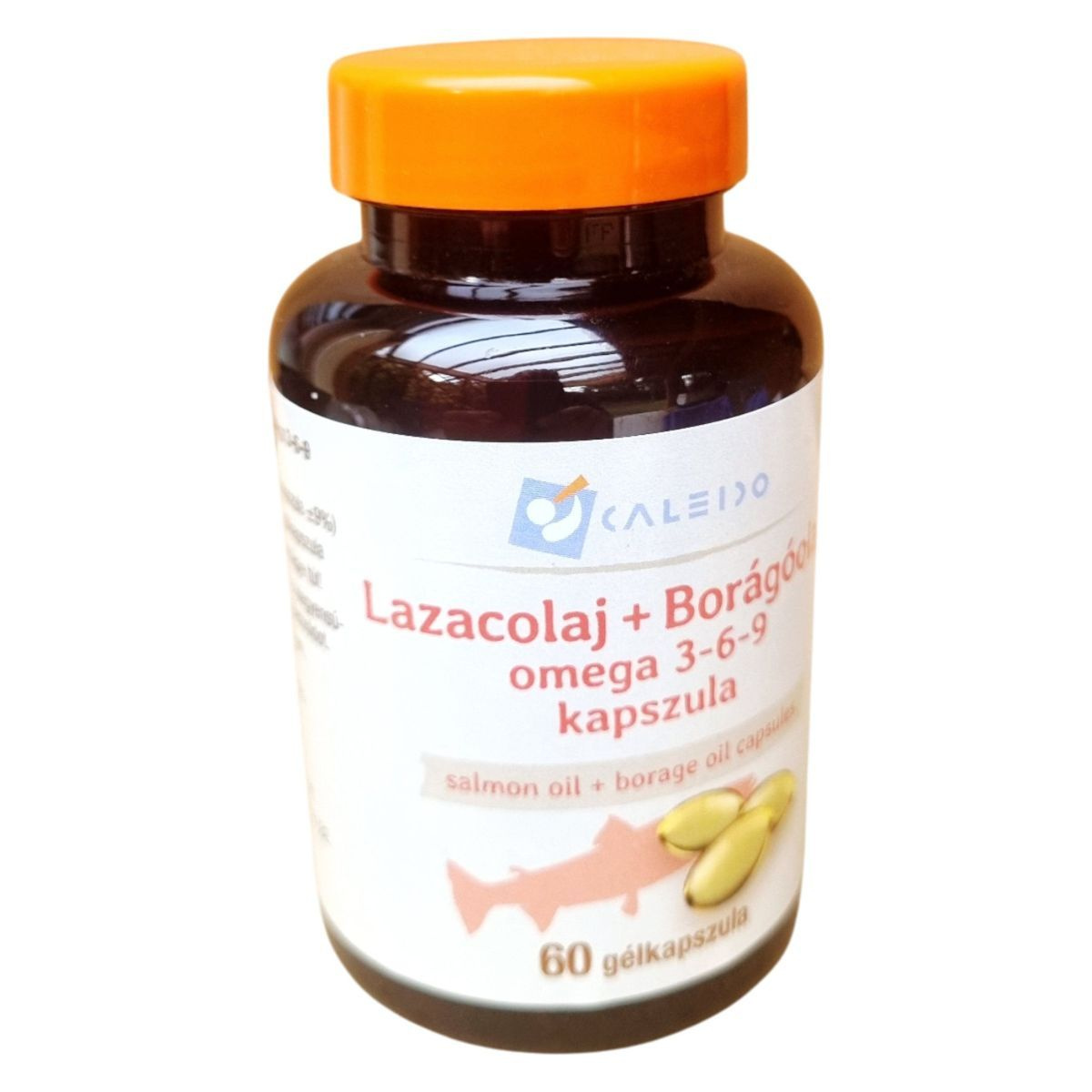 A Caleido Lazacolaj + Borágóolaj omega 3-6-9 kapszula egy étrend-kiegészítő, amely lazacolajat és borágóolajat tartalmaz. A termék 60 gélkapszulát tartalmaz, amelyek omega-3, omega-6 és omega-9 zsírsavakat biztosíthatnak. A termék antioxidáns hatású E-vitamint is tartalmaz, amely hozzájárulhat a sejtek védelméhez az oxidatív stresszel szemben. A termék Spanyolországból származik, és a Caleido IT-Outsource Kft. forgalmazza Magyarországon. Az ajánlott napi adag 2×1 gélkapszula, amelyet nem szabad túllépni. A termék halat és halszármazékokat tartalmaz, ezért allergiások számára nem ajánlott. Tárolása száraz, hűvös, fényvédett helyen javasolt, gyermekektől elzárva.