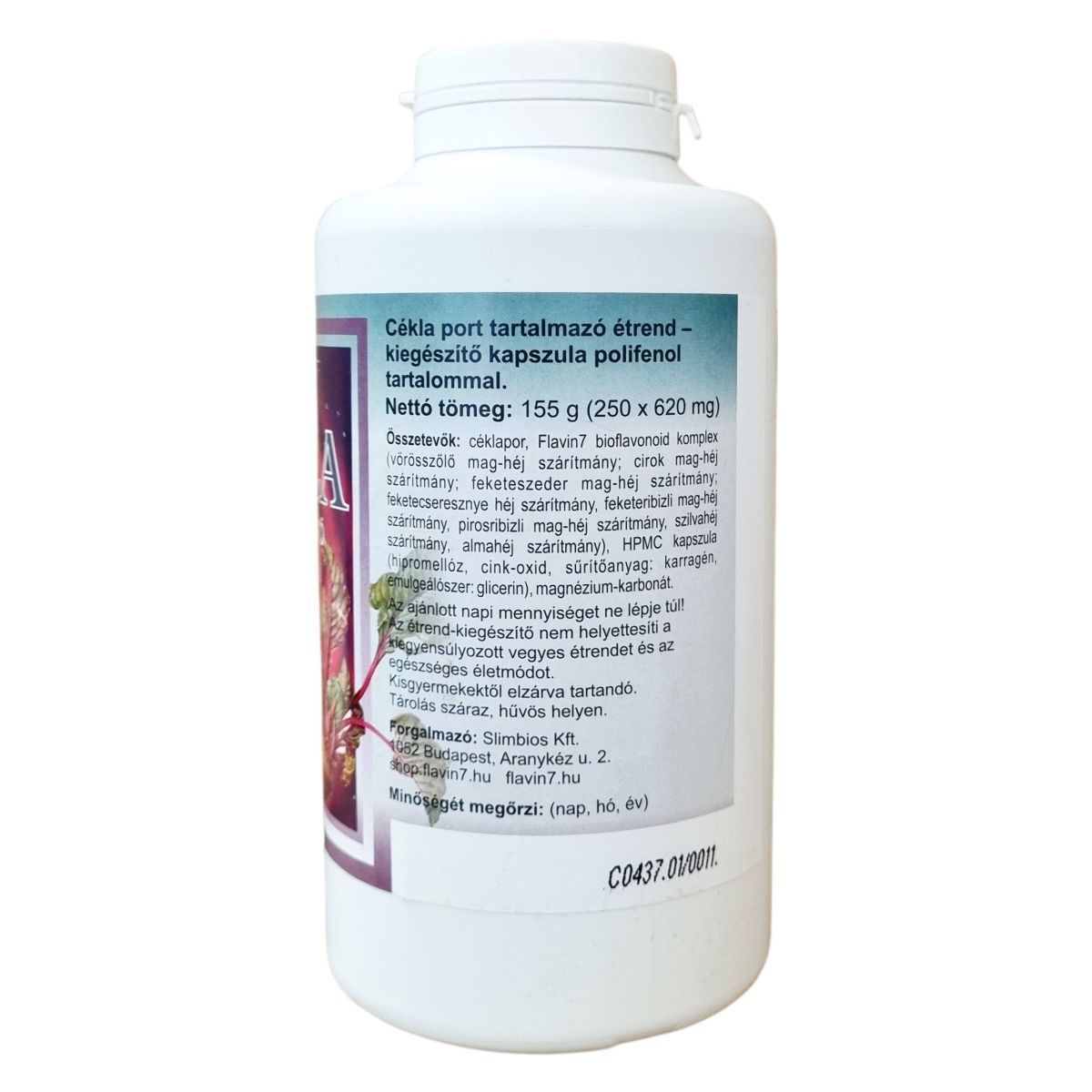 céklapor, Flavin7 bioflavonoid komplex (vörösszőlő mag-héj szárítmány; cirok mag-héj szárítmány; feketeszeder mag-héj szárítmány; fekete cseresznye héj szárítmány; feketeribizli mag-héj szárítmány; pirosribizli mag-héj szárítmány; szilvahéj szárítmány; almahéj szárítmány), HPMC kapszula (hipromellóz, cink-oxid, sűrítőanyag: karragén, emulgeálószer: glicerin), magnézium-karbonát