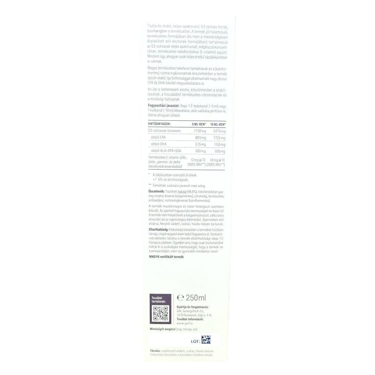 A GAL Ω3 Halolaj egy tiszta alapanyagokból előállított, teljes spektrumú Ω3-zsírsavforrás, amely természetes tokoferolokat (E-vitamin) és kámformentes rozmaringkivonatot tartalmaz az optimális stabilitás érdekében. Természetes formájában, nem etil-észterként biztosítja az EPA, DHA és más Ω3-zsírsavak koncentrált bevitelét. Az enyhe, kellemes íz a stabilitásnak, a minőségi halolajnak és a hozzáadott természetes citromolajnak köszönhető. A készítményt fenntartható fejlesztési elvek mentén állították elő, és a termék fogyasztása hozzájárulhat a megfelelő Ω3-bevitelhez. Felbontás után javasolt hűtőben tartani, tisztaságának megőrzése érdekében csak tiszta kanállal adagolandó. A termék használata nem helyettesíti a változatos és kiegyensúlyozott étrendet, illetve az egészséges életmódot.
