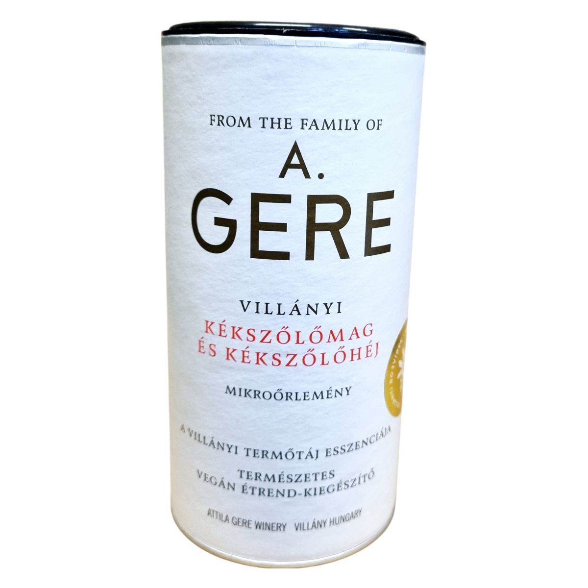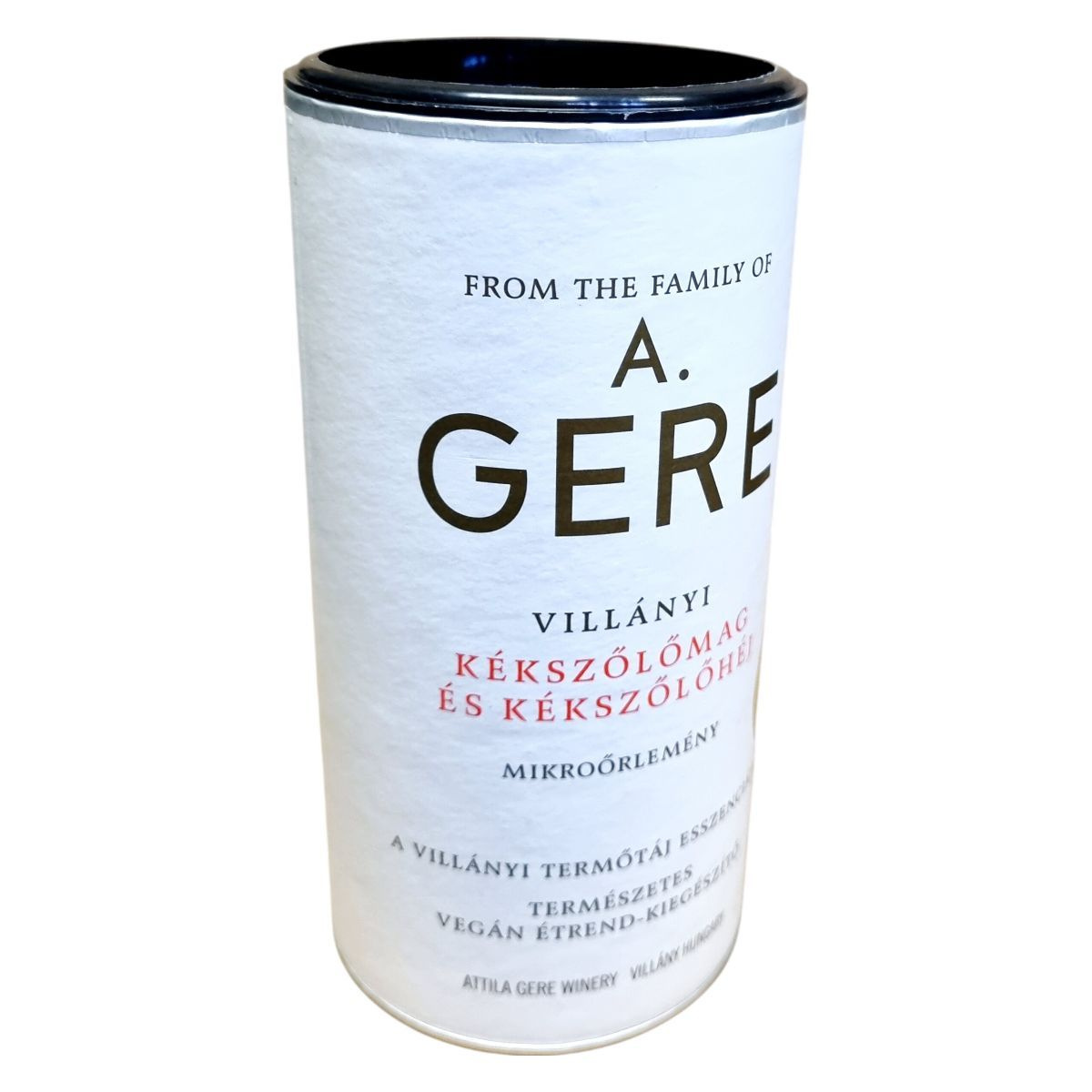 A Gere Villányi Kékszőlőmag és Kékszőlőhéj Mikroőrlemény a Villányi termőtáj esszenciáját kínálja egy természetes, vegán étrend-kiegészítő formájában. A termék 75% szőlőmag és 25% szőlőhéj őrleményt tartalmaz, segédanyagok nélkül. Az ajánlott napi adag 2x1 mokkás kanálnyi, amelyet joghurtba vagy kefirbe keverve érdemes fogyasztani. Az őrlemény önmagában, por formában történő fogyasztása nem javasolt. A termék nem helyettesíti a vegyes étrendet és az egészséges életmódot. Tárolása fénytől védett, hűvös helyen, gyermekek elől elzárva ajánlott. A termék magyar gyártója a Gere Attila Pincészete, és az OÉTI nyilvántartási száma 11609/2012.