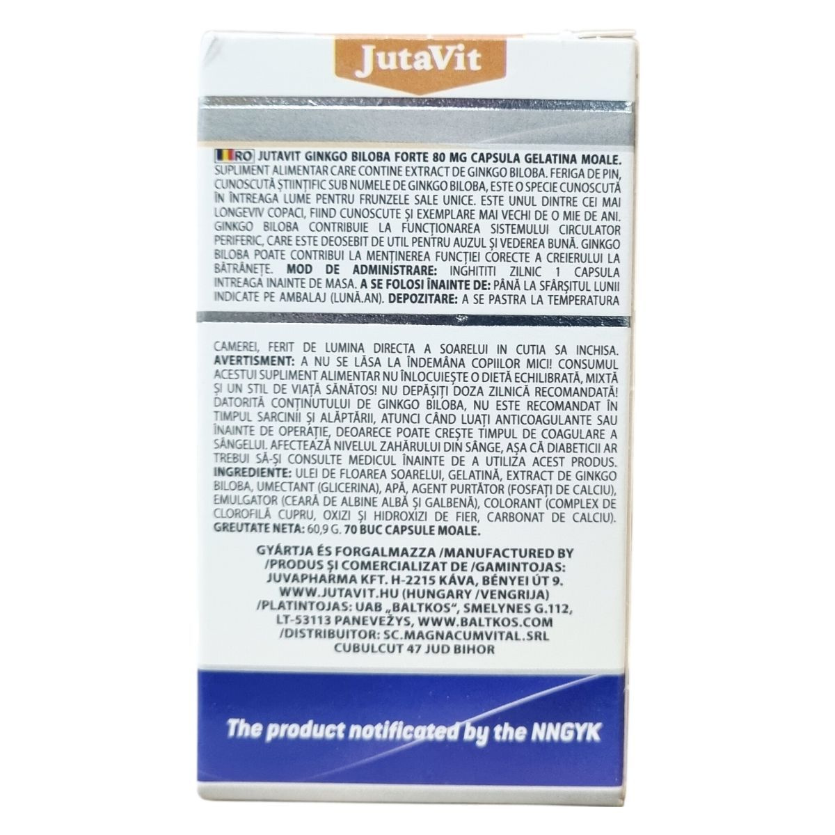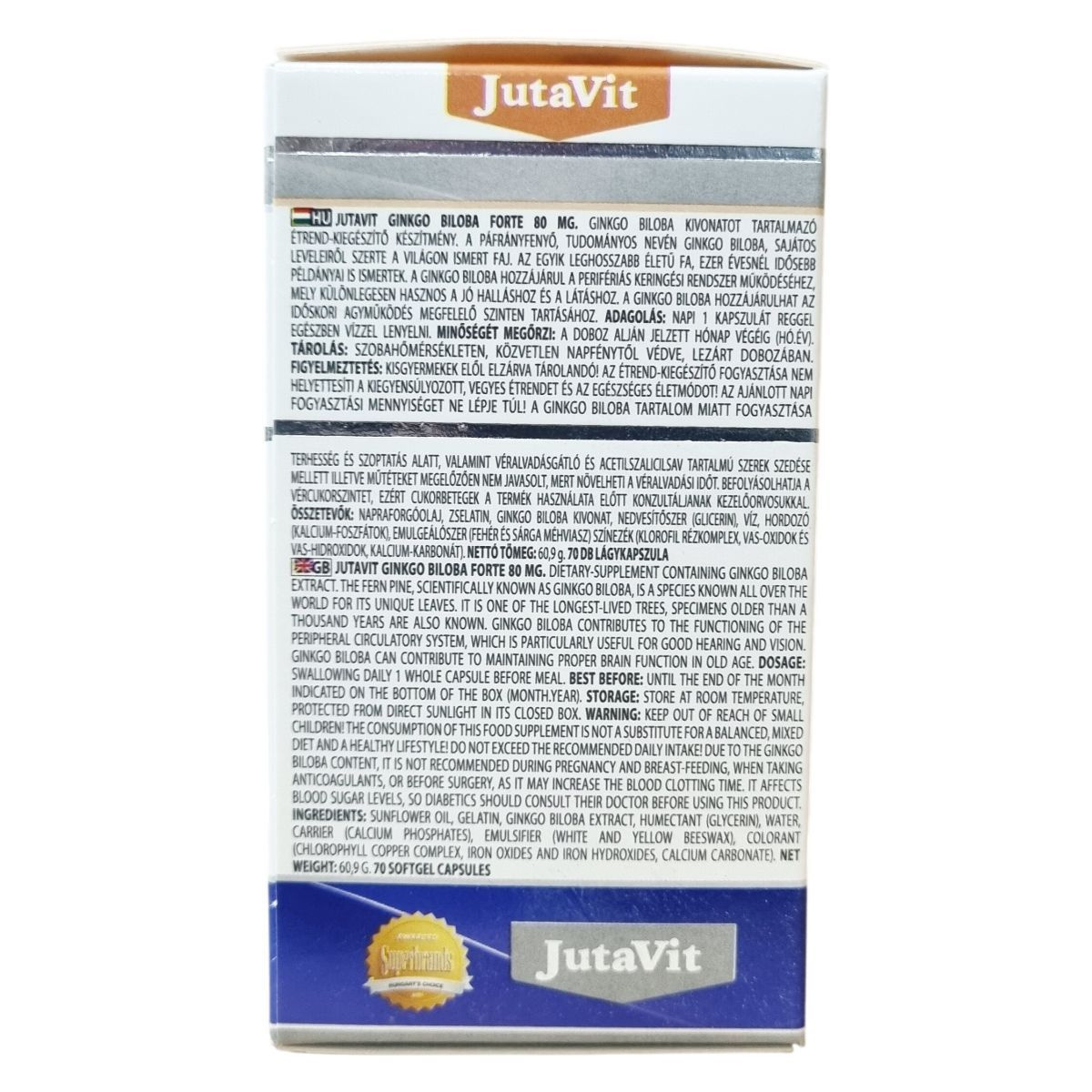 A JutaVit Ginkgo Biloba FORTE 80 mg lágyzselatin kapszula Ginkgo Biloba kivonatot tartalmazó étrend-kiegészítő, amely a páfrányfenyő speciális leveleiről készül. A Ginkgo Biloba az egyik leghosszabb életű fafaj, melynek egyes példányai több mint ezer évesek. A készítmény hozzájárulhat a perifériás keringési rendszer működéséhez, különösen előnyös lehet a hallás és látás fenntartásában. Időskorban támogathatja az agyműködés megfelelő szinten tartását. A termék 70 db lágyzselatin kapszulát tartalmaz, amelyek napraforgóolajat, zselatint és nedvesítőszerként glicerin tartalmaznak, valamint különféle segédanyagokat, mint a kalcium-foszfát, fehér és sárga méhviasz, valamint színezékek (klorofil rézkomplex, vas-oxidok, vas-hidroxidok és kalcium-karbonát). A termék használata nem ajánlott terhesség és szoptatás alatt, illetve véralvadásgátló vagy acetilszalicilsav szedése esetén, valamint műtét előtt. Cukorbetegek esetében orvosi konzultáció szükséges a használat előtt. A kapszulák tárolása szobahőmérsékleten, fénytől védve, és gyermekek elől elzárva javasolt.