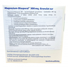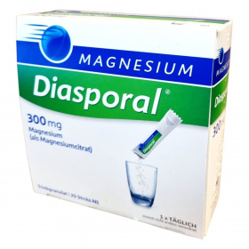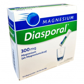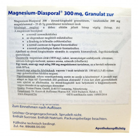 A Magnesium-Diasporal 300 mg egy étrend-kiegészítő granulátum, amely 20 db 5g granulátumot tartalmazó tasakban kapható. A termék könnyen oldódik vízben vagy gyümölcslében, és narancs ízesítésű. A magnézium hozzájárulhat a normál izomműködéshez, az idegrendszer megfelelő működéséhez, a fáradtság és kifáradás csökkentéséhez, valamint a normál csontozat és fogazat fenntartásához. Ajánlható várandós és szoptatós kismamáknak, fogyókúrázóknak, sportolóknak. A termék nem pezseg, és szacharózt, valamint nátriumot tartalmaz. A granulátum technikai okokból nem teljesen tölti ki a tasakot.