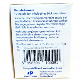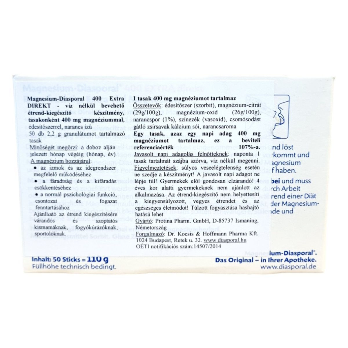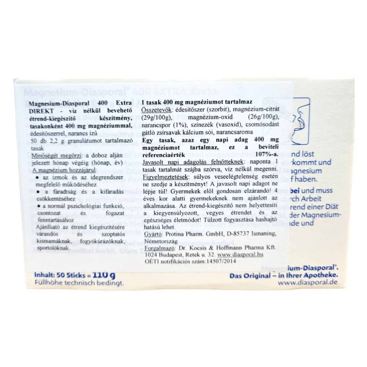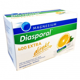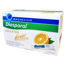 A Magnesium Diasporal 400 EXTRA direkt egy víz nélkül bevehető étrend-kiegészítő, amely tasakonként 400 mg magnéziumot tartalmaz. A magnézium hozzájárulhat az izmok és az idegrendszer megfelelő működéséhez, valamint a fáradtság és a kifáradás csökkentéséhez. A termék narancs ízű, édesítőszerrel készült, és 50 db, 2,2 g granulátumot tartalmazó tasakot tartalmaz. Ajánlott várandós és szoptató kismamáknak, fogyókúrázóknak és sportolóknak az étrend kiegészítésére. A termék nem helyettesíti a változatos, kiegyensúlyozott étrendet és az egészséges életmódot.
