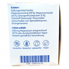 Édesítőszer (szorbit), magnézium-citrát (29g/100g), magnézium-oxid (26g/100g), narancspor (1%), színezék (vasoxid), csomósodást gátló zsírsavak kálcium sói, narancsaroma.