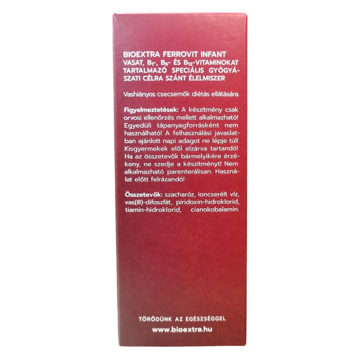 A BIOEXTRA FERROVIT Infant egy különleges gyógyászati célra szánt élelmiszer, amely vasat valamint B1-, B6- és B12-vitaminokat tartalmaz. Kifejezetten vashiányos csecsemők diétás ellátására fejlesztették ki, hogy támogassa a megfelelő vérképzést. A termék adagolása orvosi ellenőrzés mellett, a csomagoláson szereplő ajánlás szerint történjen. Felhasználása során figyelembe kell venni a figyelmeztetéseket és csak a javasolt mennyiségben szabad alkalmazni. A készítmény laktóz-, glutén- és titán-dioxid-mentes, felhasználása során biztosítani kell a megfelelő tárolást, hogy megőrizze minőségét. Nem alkalmazható parenterálisan, és használat előtt fel kell rázni. A termék nem helyettesíti a változatos étrendet és egyedüli tápanyagforrásként nem alkalmas.