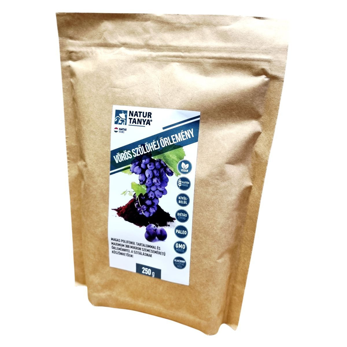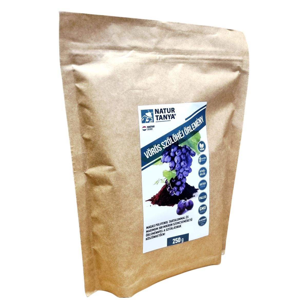 A Natur Tanya® Vörös Szőlőhéj Őrlemény egy 100%-ban magyar tulajdonú cég terméke, amely a vörös szőlő héjának 300 mikronos őrlésével készült. Ez a folyamat lehetővé teszi, hogy a benne található tápanyagok felszínre kerüljenek, és a szervezetben kifejthessék jótékony hatásukat. A termék élelmi rostban gazdag, és hozzájárulhat a diétás étrendhez. Kellemes savanykás ízű, és különféle ételekhez, italokhoz keverhető. Külsőleg alkalmazva frissítő arcpakolásként is használható. A termék megvásárlásával magyar munkahelyeket támogathat.