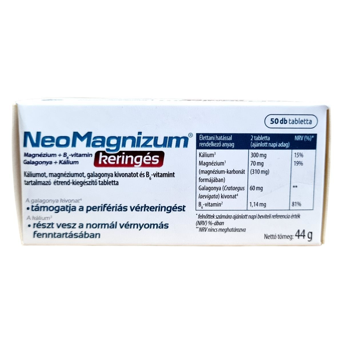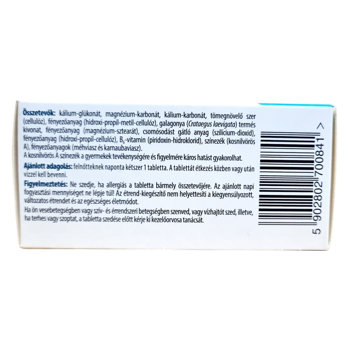 Káliumot, magnéziumot, galagonya kivonatot és B6 vitamint tartalmazó étrend-kiegészítő tabletta.