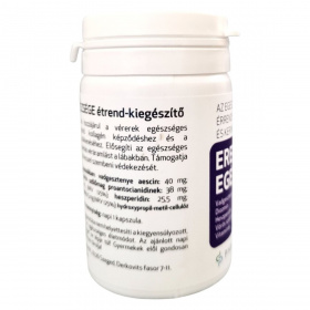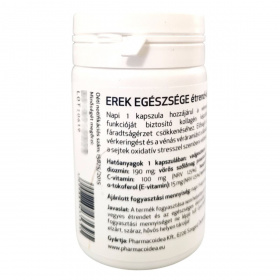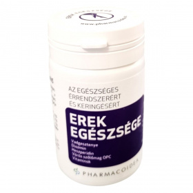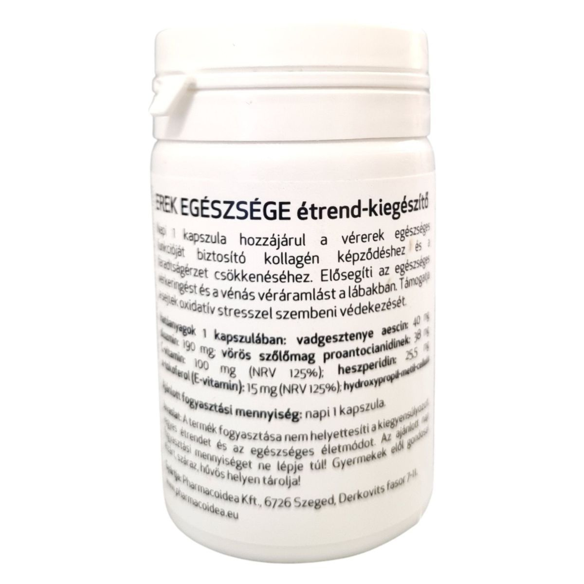 Az EREK EGÉSZSÉGE étrend-kiegészítő napi 1 kapszula formájában fogyasztva hozzájárulhat a vérerek egészséges funkcióját biztosító kollagén képződéshez, a fáradtságérzet csökkenéséhez, és támogathatja a sejtek oxidatív stresszel szembeni védekezését. A termék hatóanyagai között megtalálható a vadgesztenye aescin, diozmin, vörös szőlőmag proantocianidinek, C-vitamin, heszperidin és a-tokoferol (E-vitamin). A termék fogyasztása nem helyettesíti a kiegyensúlyozott, vegyes étrendet és az egészséges életmódot. Az ajánlott napi fogyasztási mennyiséget ne lépje túl! Gyermekek elől gondosan zárt, száraz, hűvös helyen tárolja! Gyártja a Pharmacoidea Kft., Szegeden.