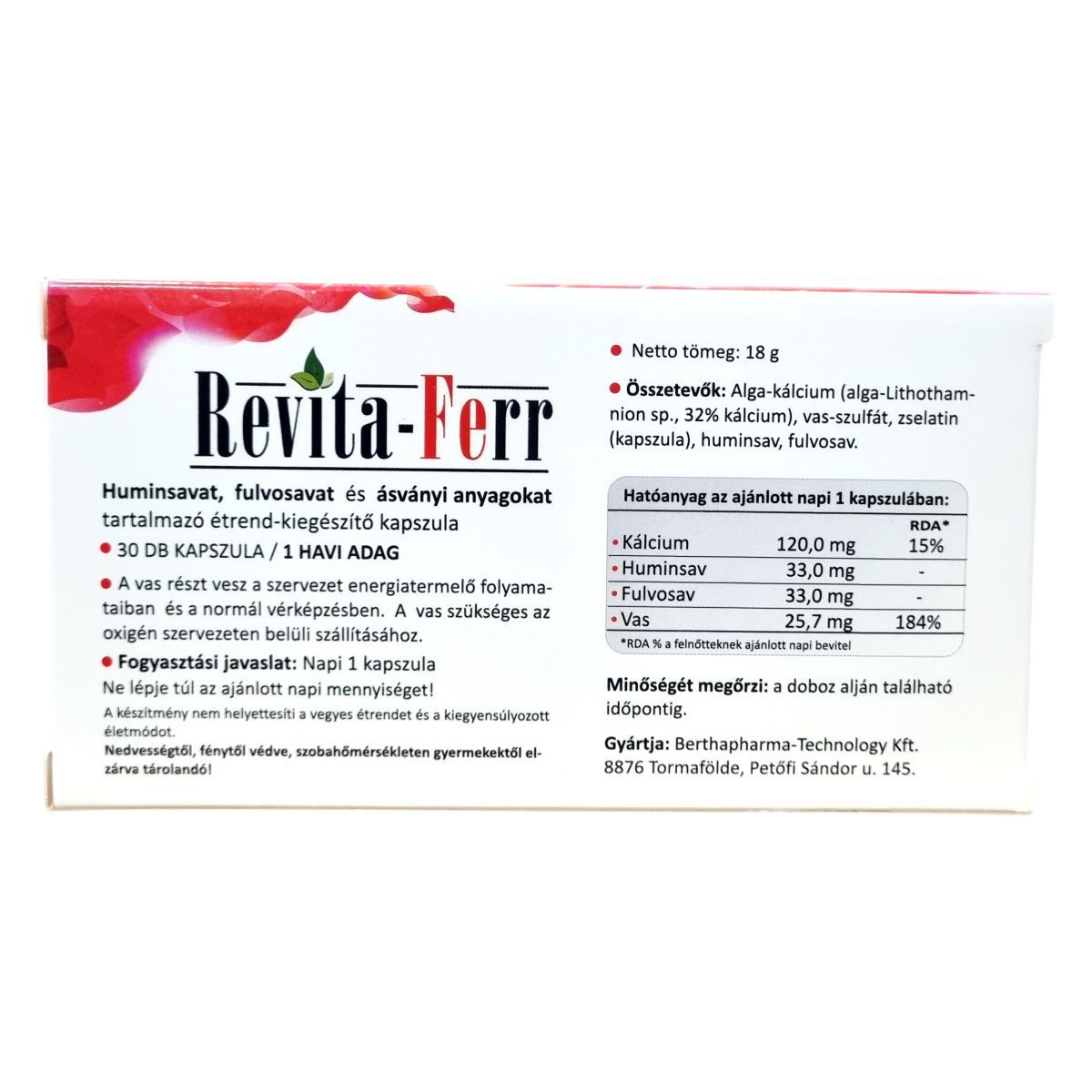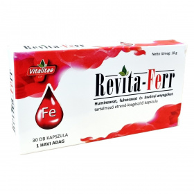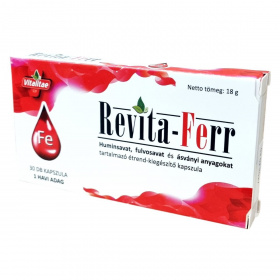A Revita-Ferr étrend-kiegészítő kapszula huminsavat, fulvosavat és ásványi anyagokat, köztük vasat és kálciumot tartalmaz. A vas részt vesz a szervezet energiatemelő folyamataiban és a normál vérképzésben, nélkülözhetetlen az oxigén szervezeten belüli szállításához. A kalcium fontos ásványi anyag, mely a kapszulában alga eredetű formában található meg. A kapszula huminsavat és fulvosavat is tartalmaz, amelyek természetes eredetűek. A termék 30 darab kapszulát tartalmaz, ami egy havi adagot jelent.