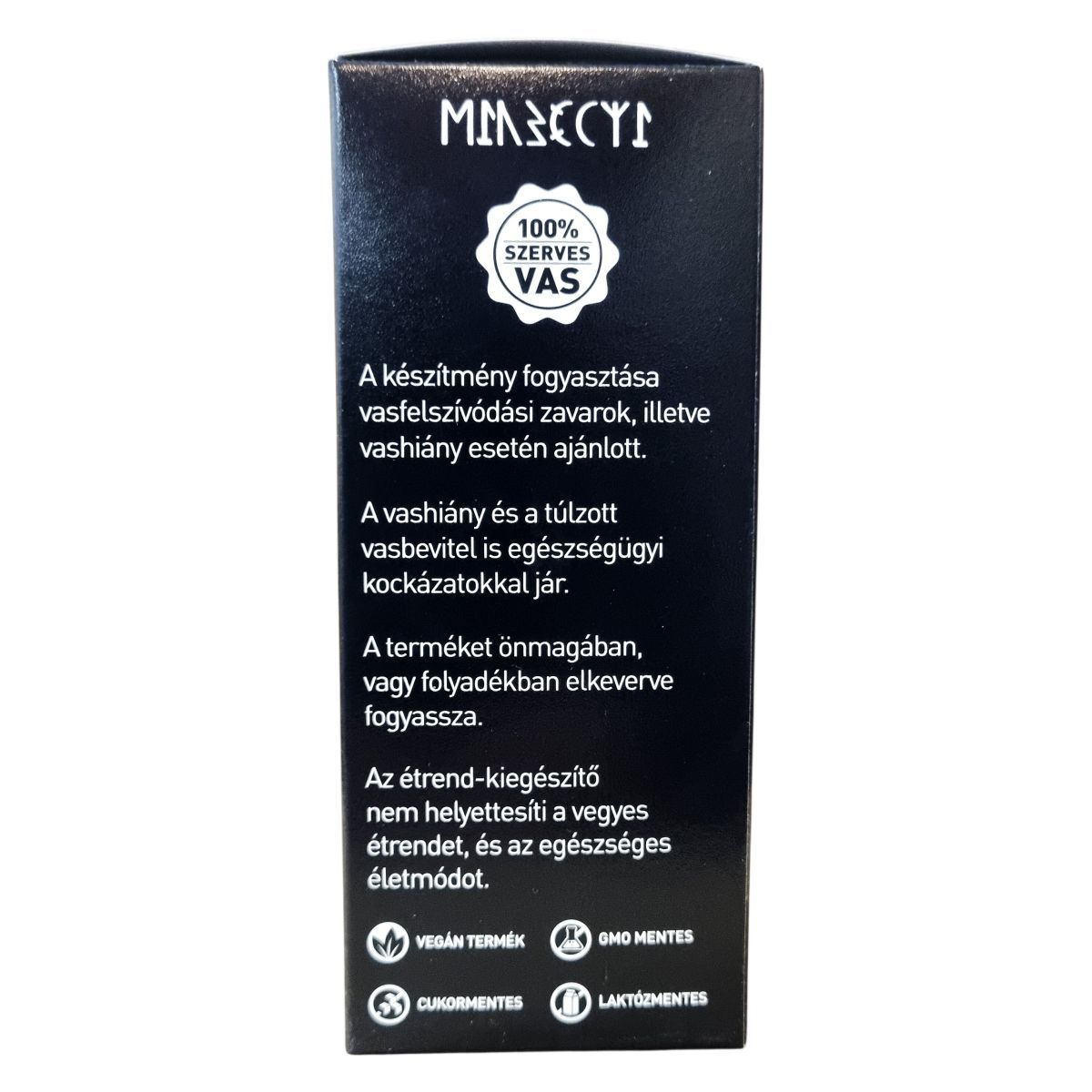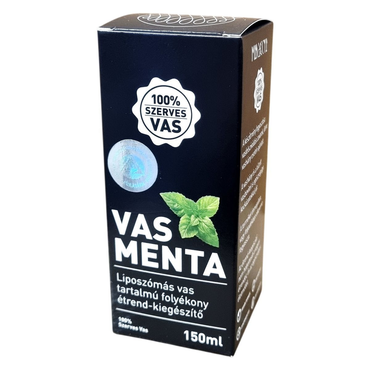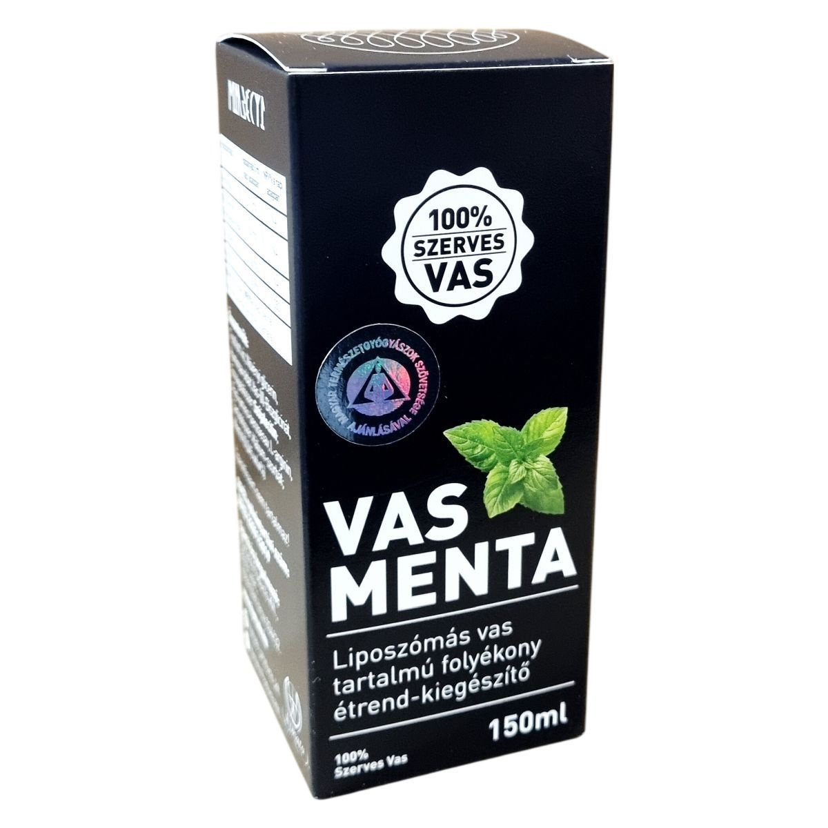 A Hymato Products Kft. által gyártott Vas Menta egy 150 ml-es, liposzómás vas tartalmú folyékony étrend-kiegészítő, amely a vas felszívódási zavarainak és vashiánynak a kezelésére ajánlott. A termék 100%-ban szerves vasat tartalmaz, ami jól hasznosuló formában áll rendelkezésre. A készítmény hatóanyagai közé tartozik a huminsav, para-amino-benzoesav (PABA) és az L-arginin, melyek együttes jelenléte támogathatja a vas felszívódását és hasznosulását a szervezetben. A termék emulgeálószere szójalecitin, és tartósítószere kálium-szorbát, továbbá mentolt is tartalmaz, édesítőszert viszont nem. Ez a termék vegánoknak is megfelelő, GMO-, cukor- és laktózmentes. A kezelendő adagot napi 5 ml jelenti, amit felrázva, egyedül vagy folyadékban elkeverve javasolt fogyasztani. Gyermekek elől elzárva kell tartani, és 6 év alatti gyermekeknek nem adható. A termék hűvös, fénytől védett, száraz helyen történő tárolást igényel, felbontás után pedig hűtőszekrényben kell tartani, és 30 napon belül el kell fogyasztani. Az étrend-kiegészítő nem helyettesíti a vegyes étrendet és az egészséges életmódot, továbbá a túlzott vasbevitel egészségkárosító hatású lehet, ezért a fogyasztásakor ajánlott az előírásokat betartani.