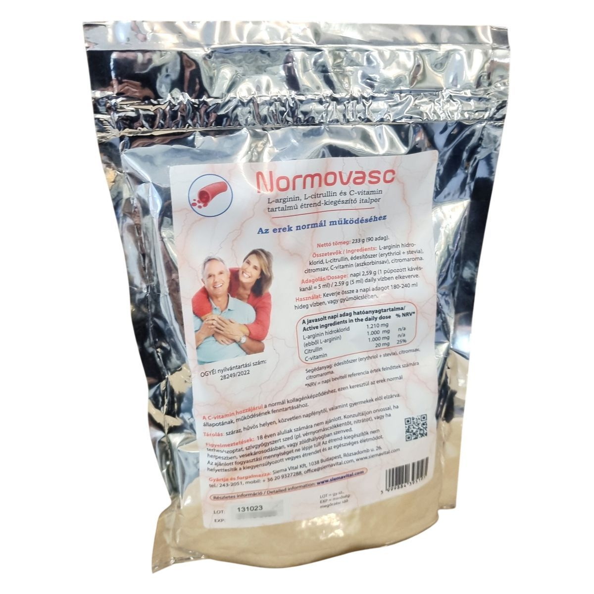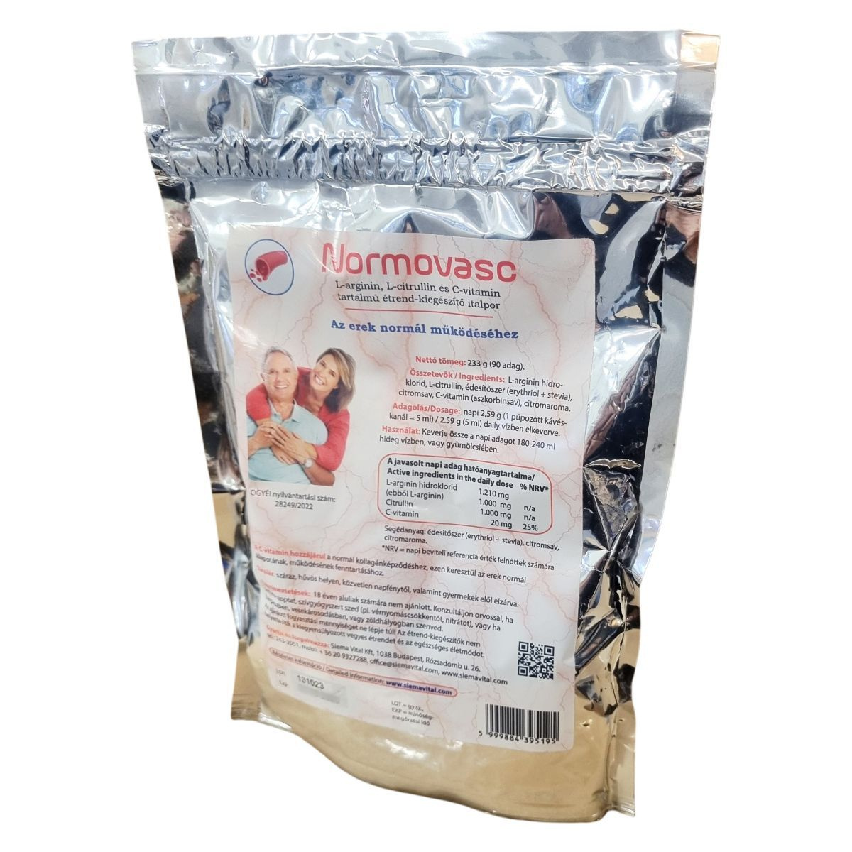 A Normovasc étrend-kiegészítő italpor L-arginin hidrokloridot, L-citrullint és C-vitamint tartalmaz, melyek hozzájárulhatnak az erek normál működéséhez. Az italpor édesítőszerrel (erythritol és stevia), citromsavval és természetes citromaromával ízesített. A termék napi adagja 2,59 gramm, mely egy púpozott kávéskanálnak felel meg, és hideg vízben vagy gyümölcslében kell feloldani. A C-vitamin hozzájárul a normál kollagénképződéshez, ezáltal támogathatja az erek állapotának és működésének fenntartását. A termék 233 grammos kiszerelésben, 90 adagot tartalmaz.